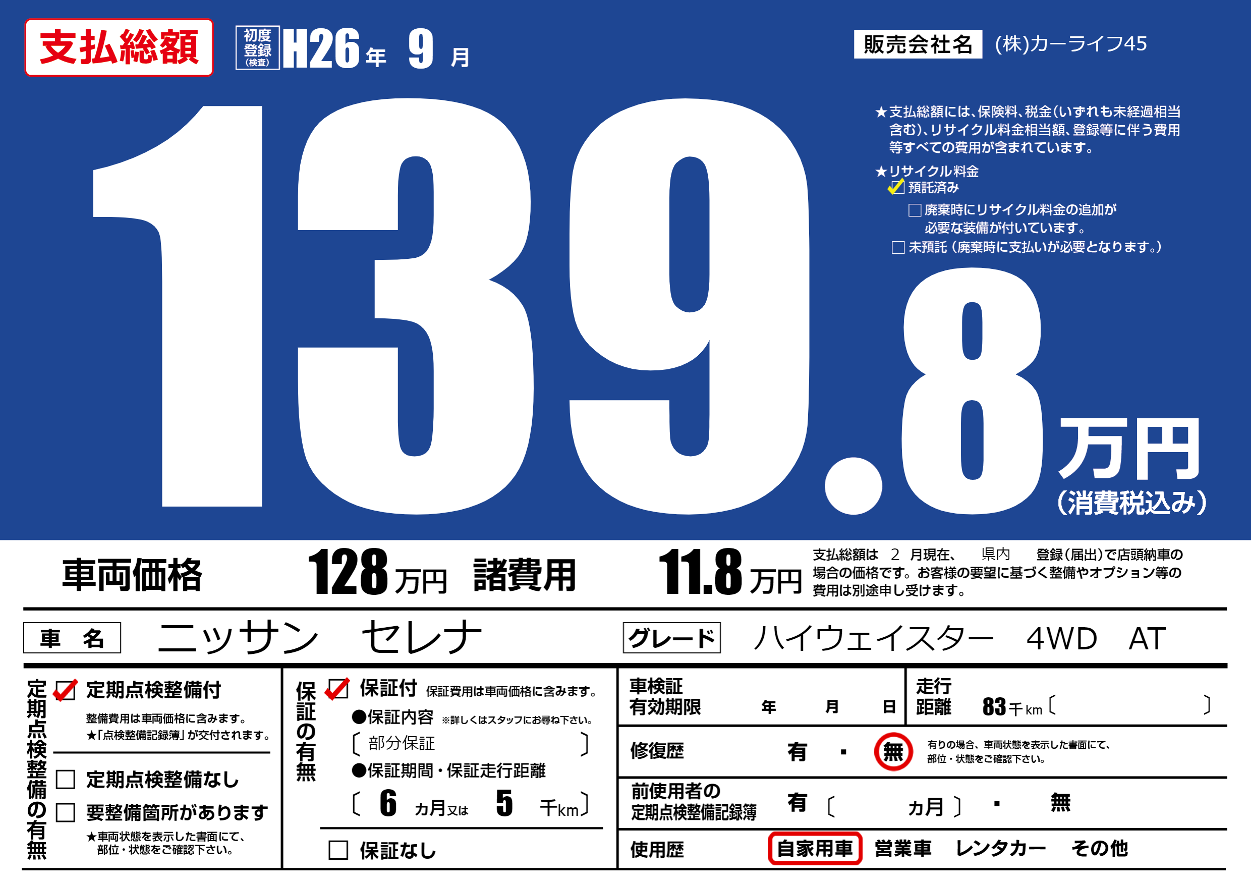 | 走行キロ | 8.3万km | 初年度登録 | H26年9月 |