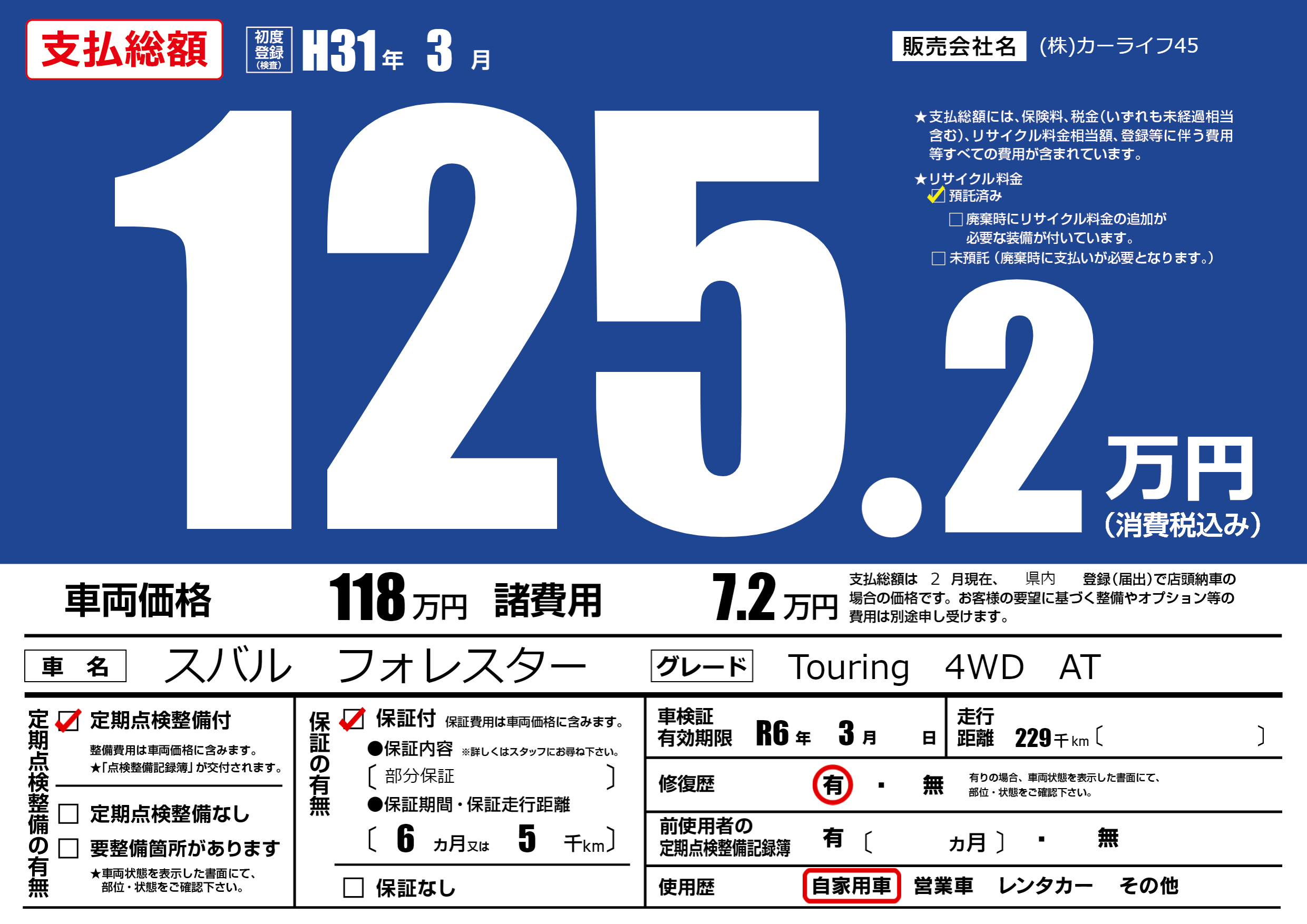 | 車検制限 | R6年 3月 - 日 | ||