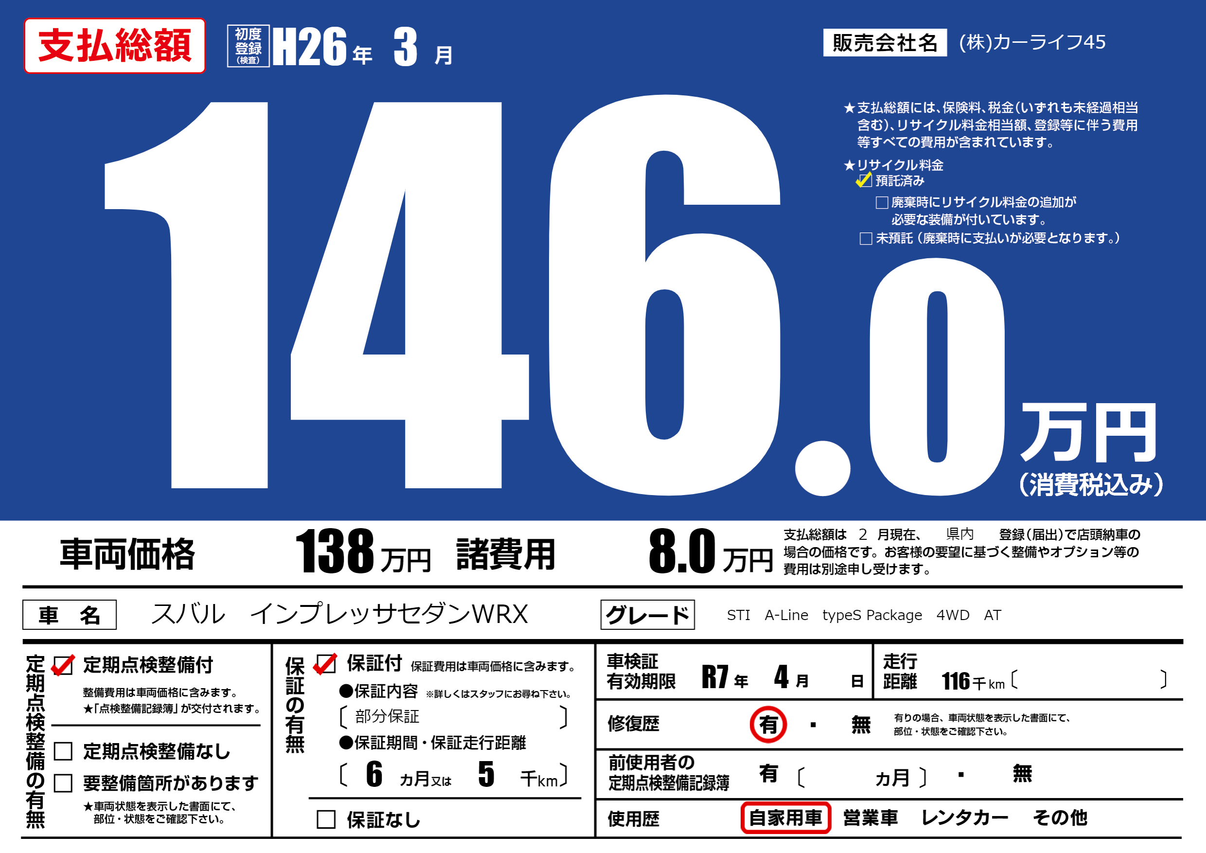 | 車名 | スバル インプレッサセダンWRX | グレード ミッション 排気量 |