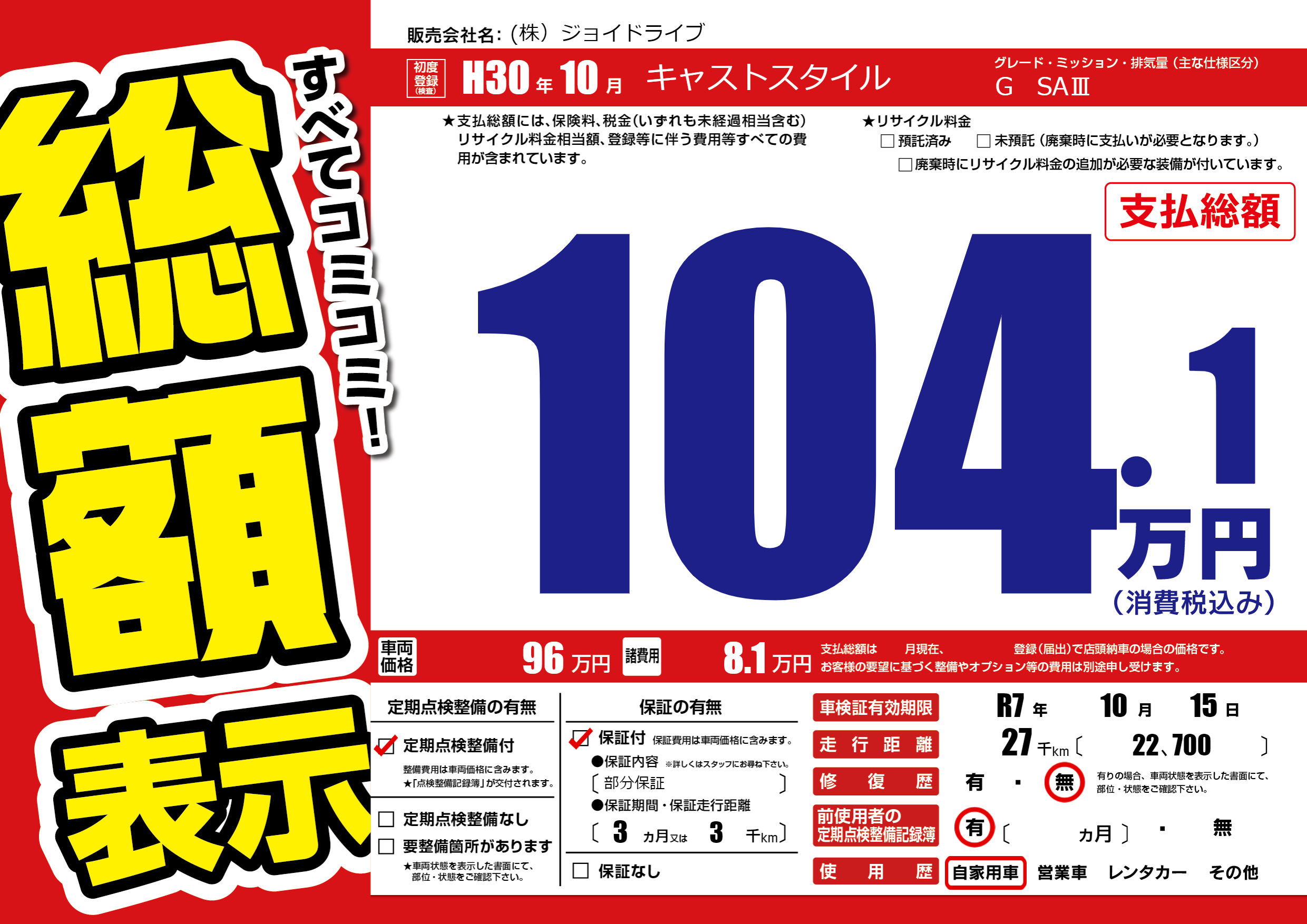 | 車名 | キャストスタイル | グレード ミッション 排気量 |