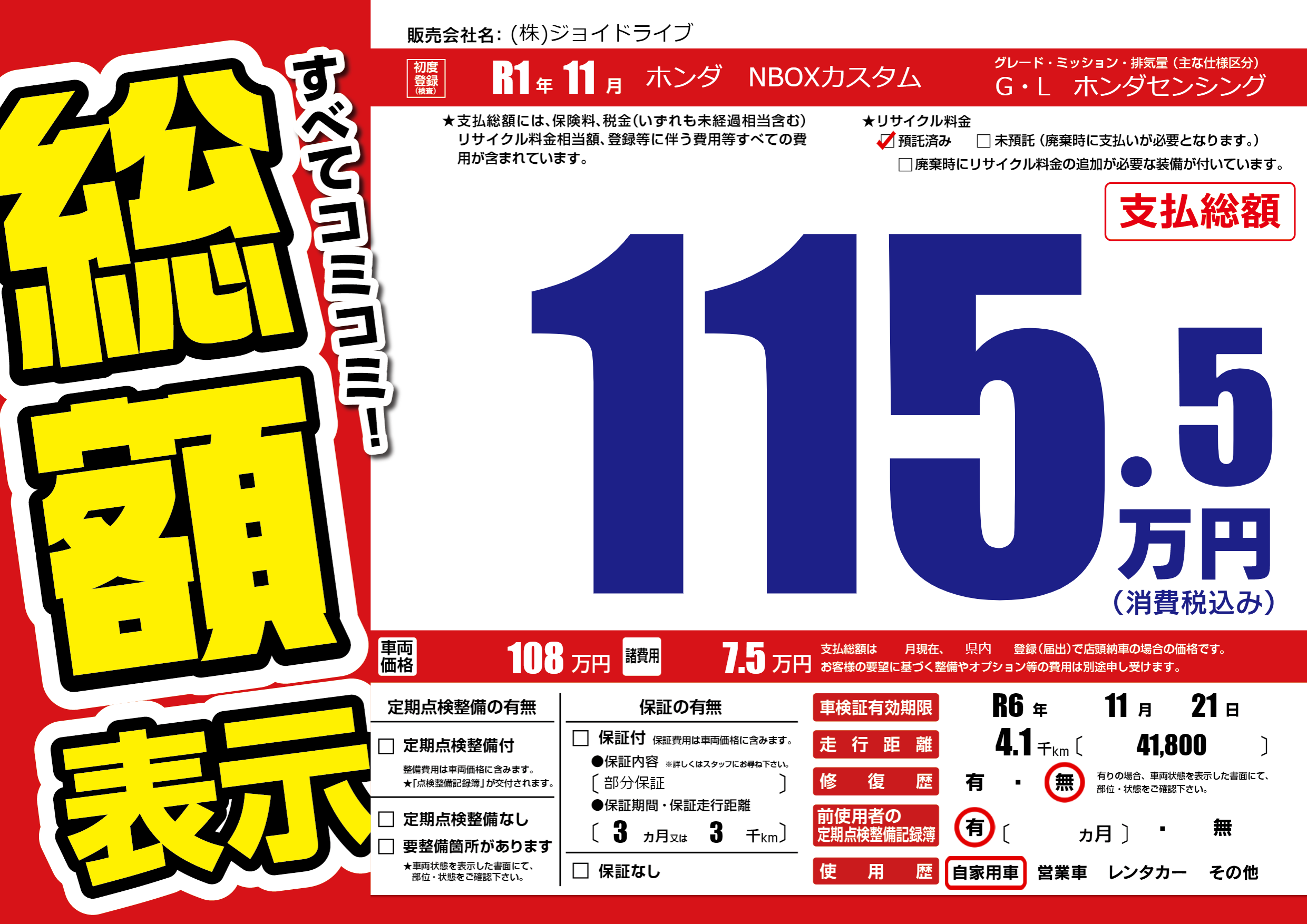 | 走行キロ | 0.4万km | 初年度登録 | R1年11月 |