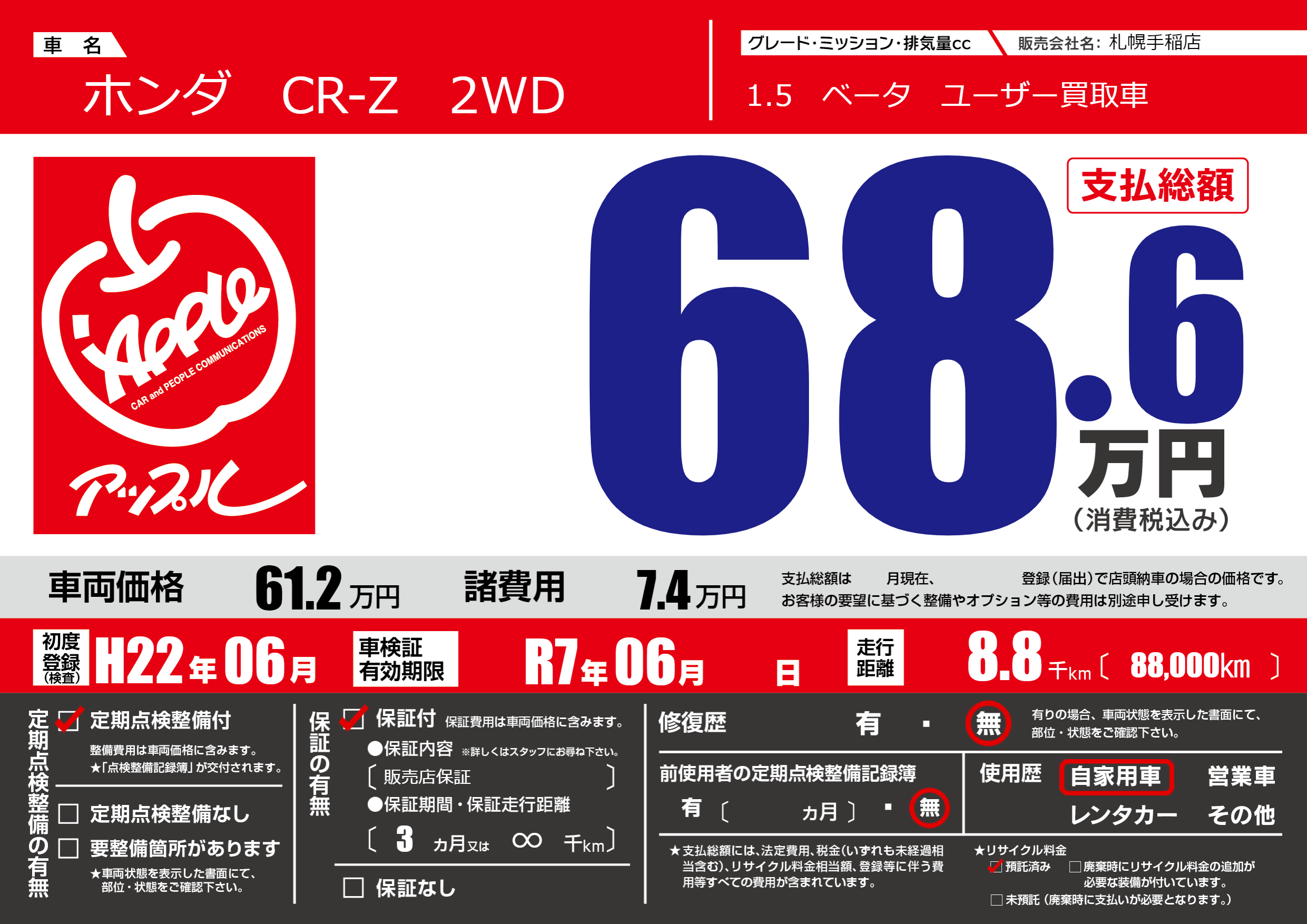 | 走行キロ | 0.8万km | 初年度登録 | H22年06月 |