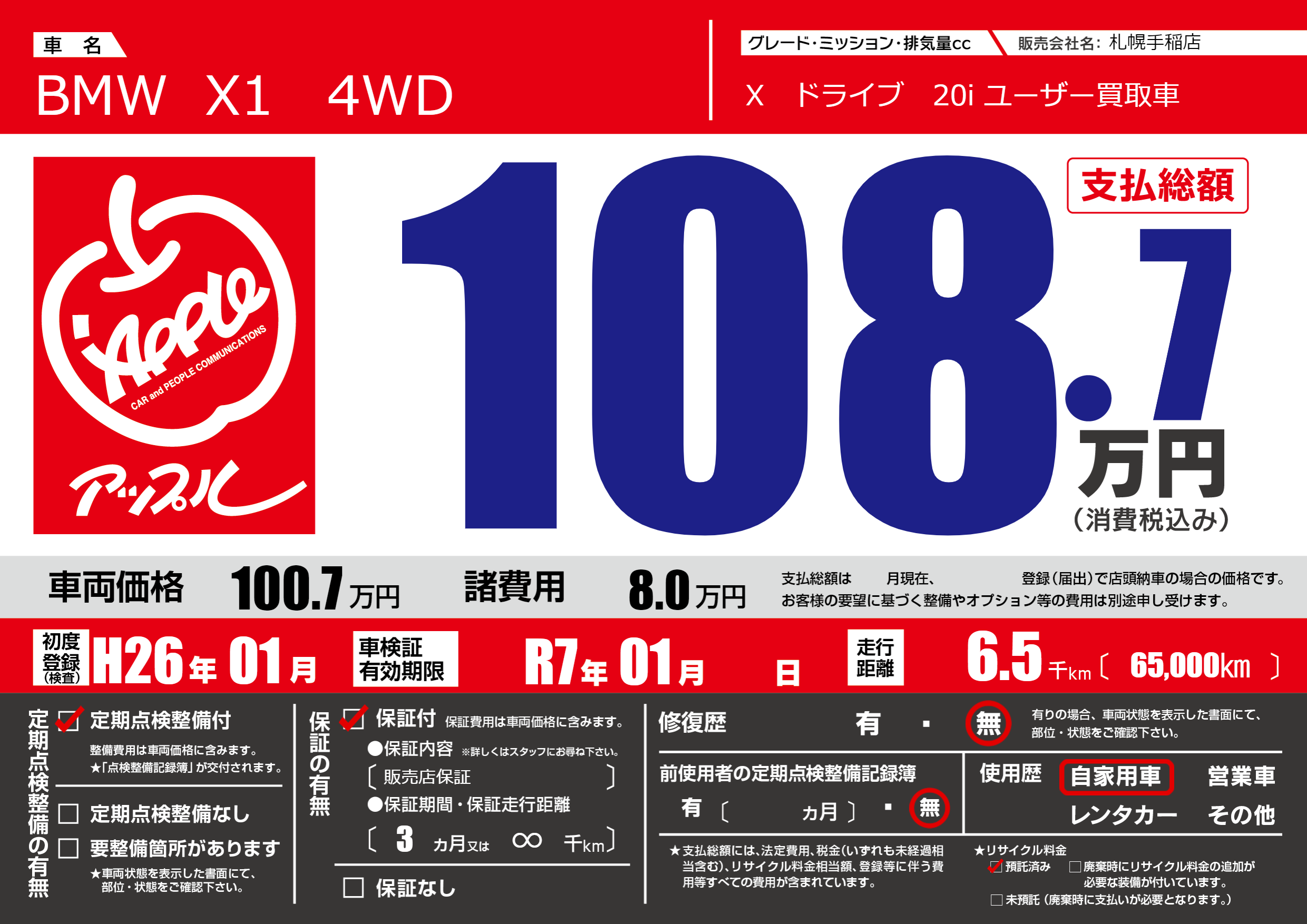 | 車名 | BMW X1 4WD | グレード ミッション 排気量 |