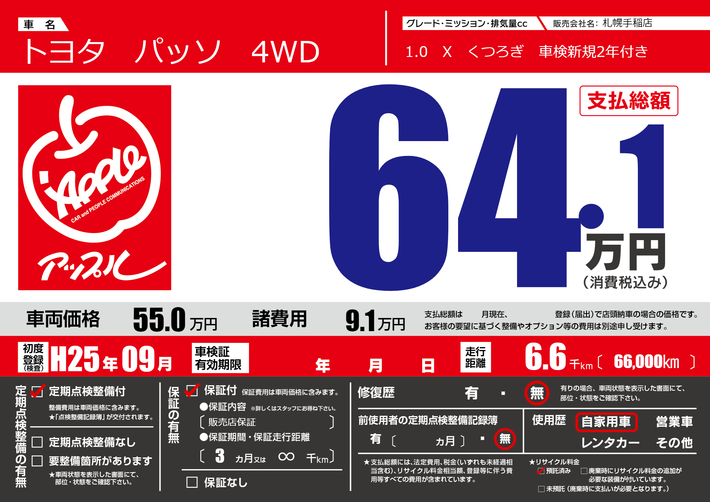 | 車名 | トヨタ パッソ 4WD | グレード ミッション 排気量 |