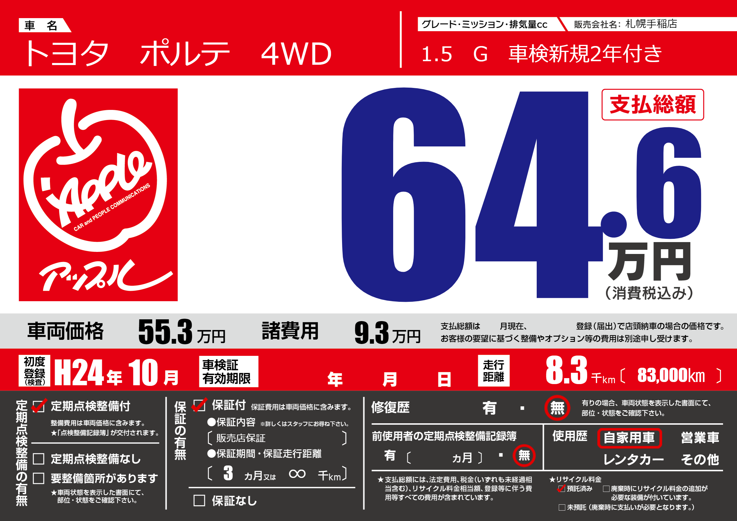 | 車名 | トヨタ ポルテ 4WD | グレード ミッション 排気量 |