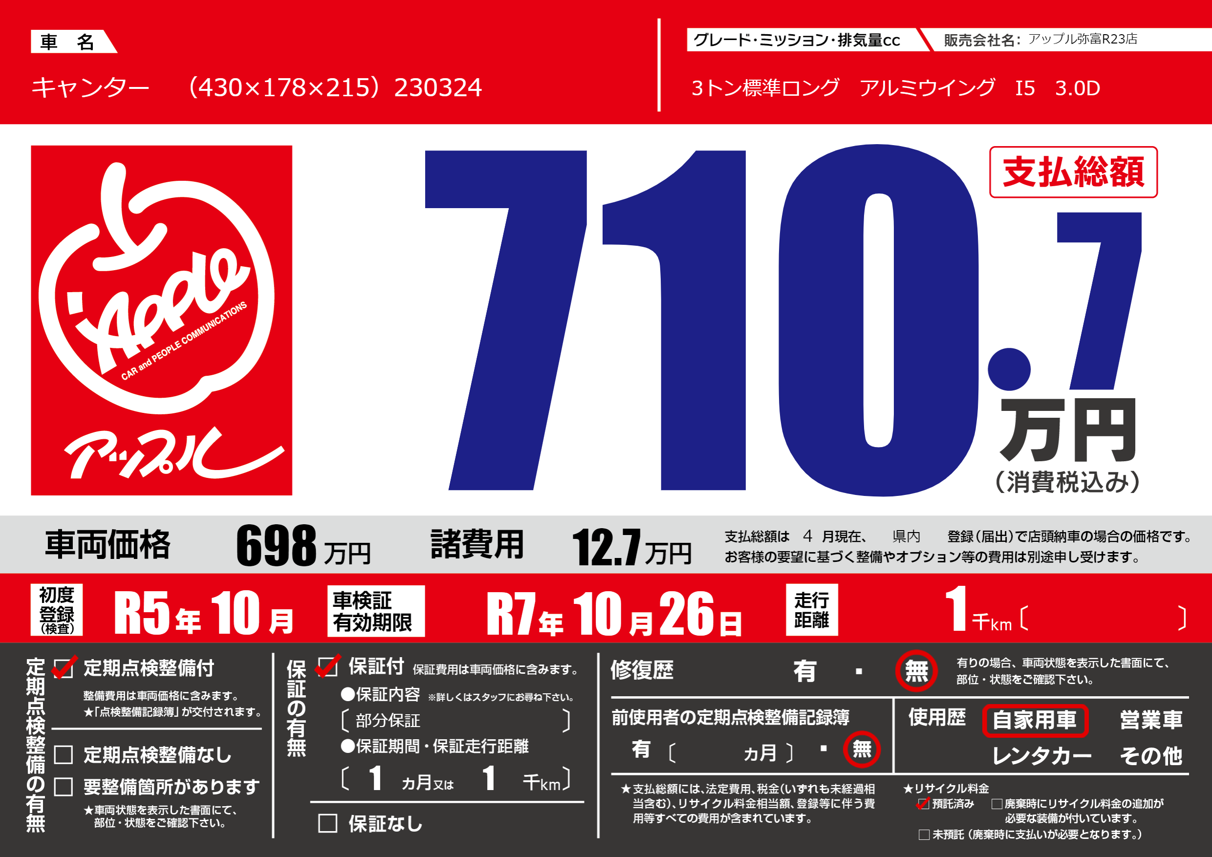| 車名 | キャンター (430×178×215)230324 | グレード ミッション 排気量 |