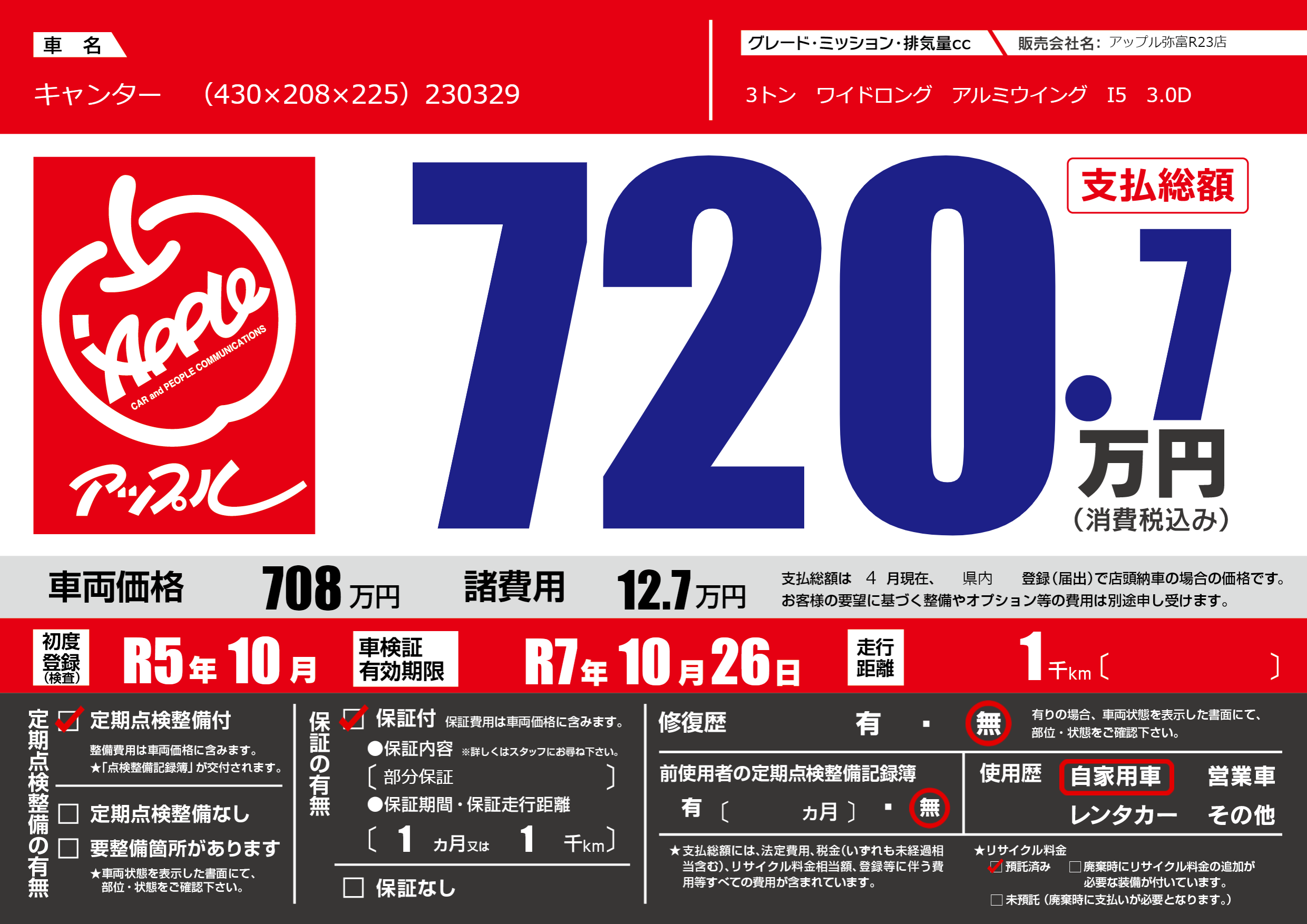 | 車名 | キャンター (430×208×225)230329 | グレード ミッション 排気量 |