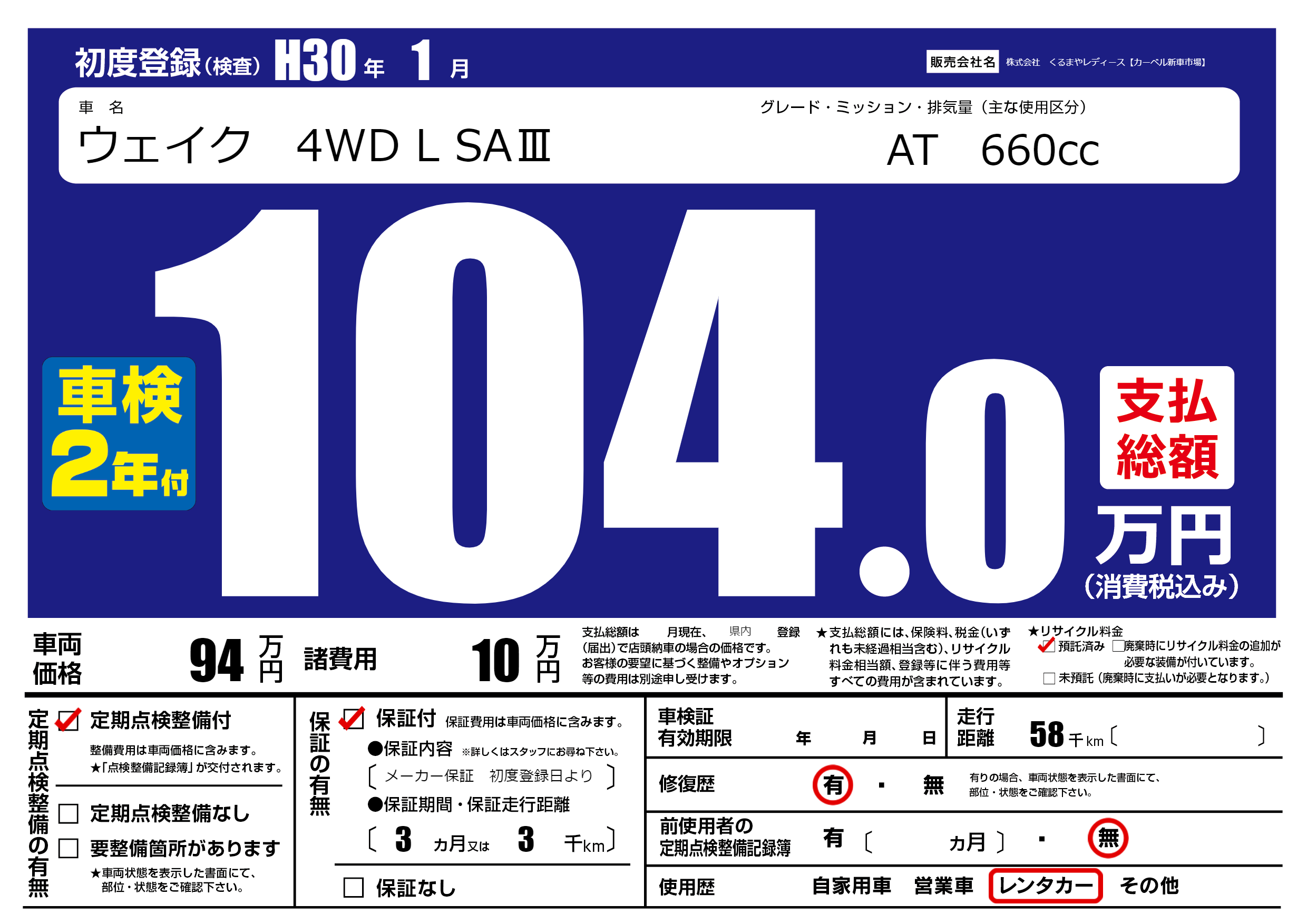 | 車名 | ウェイク 4WD L SAⅢ | グレード ミッション 排気量 |