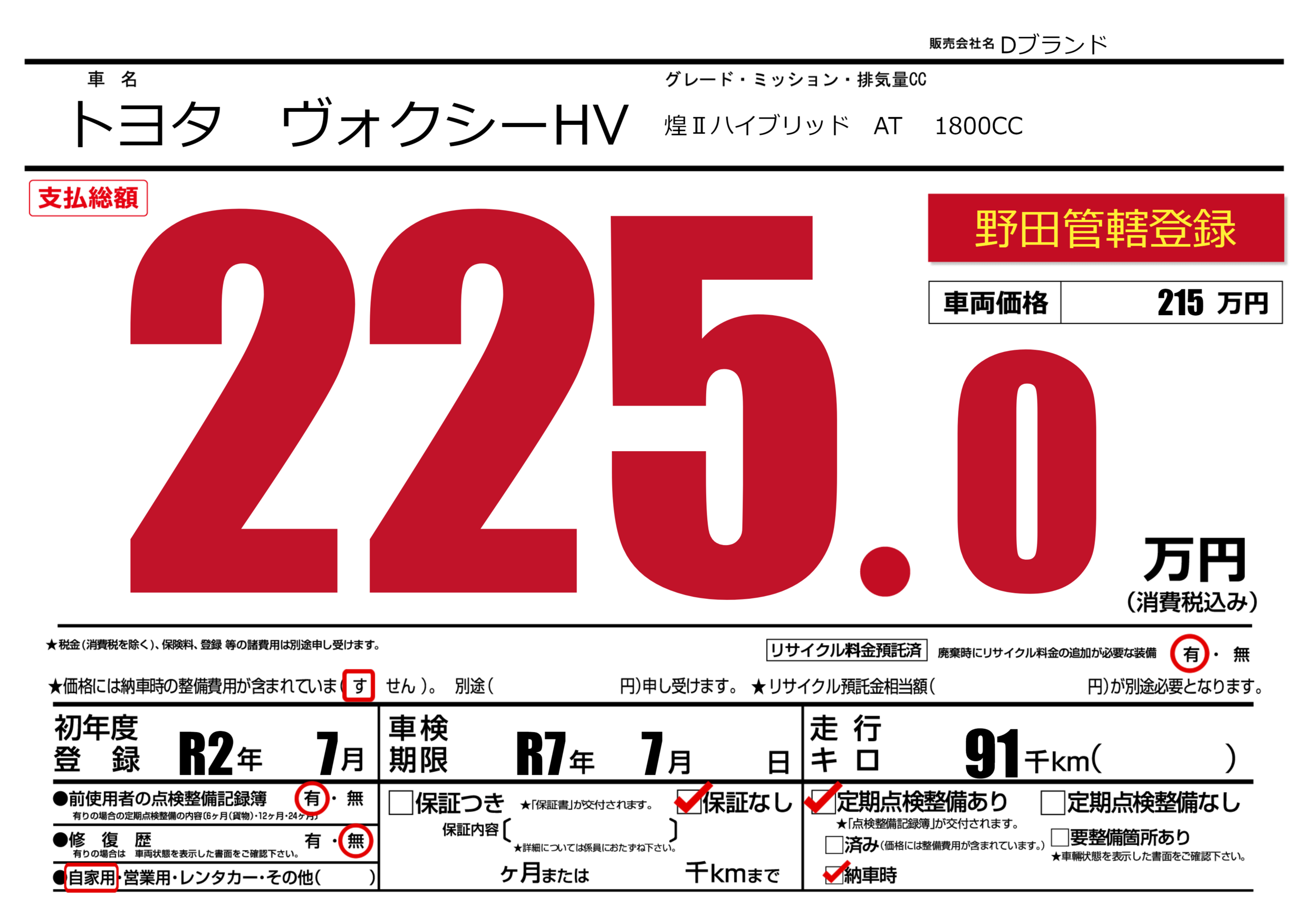 | 車名 | トヨタ ヴォクシーHV | グレード ミッション 排気量 |