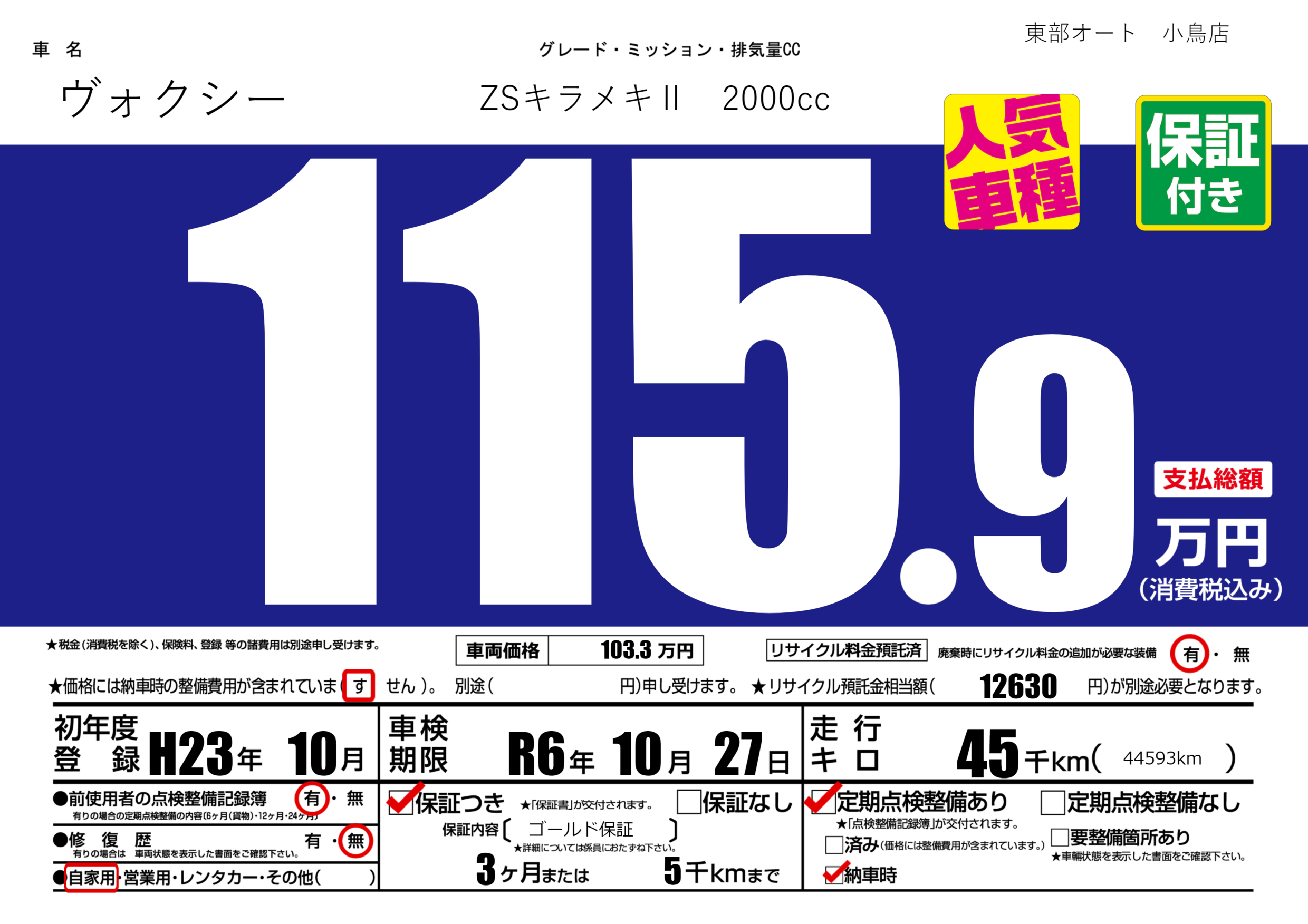 保証付き 保証内容( ゴールド保証) 3ヶ月または(5)千kmまで |