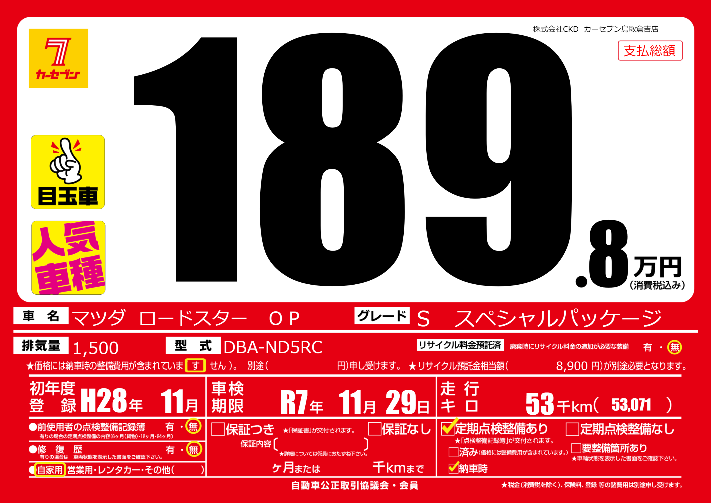 | 車検制限 | R7年 11月 29日 | ||