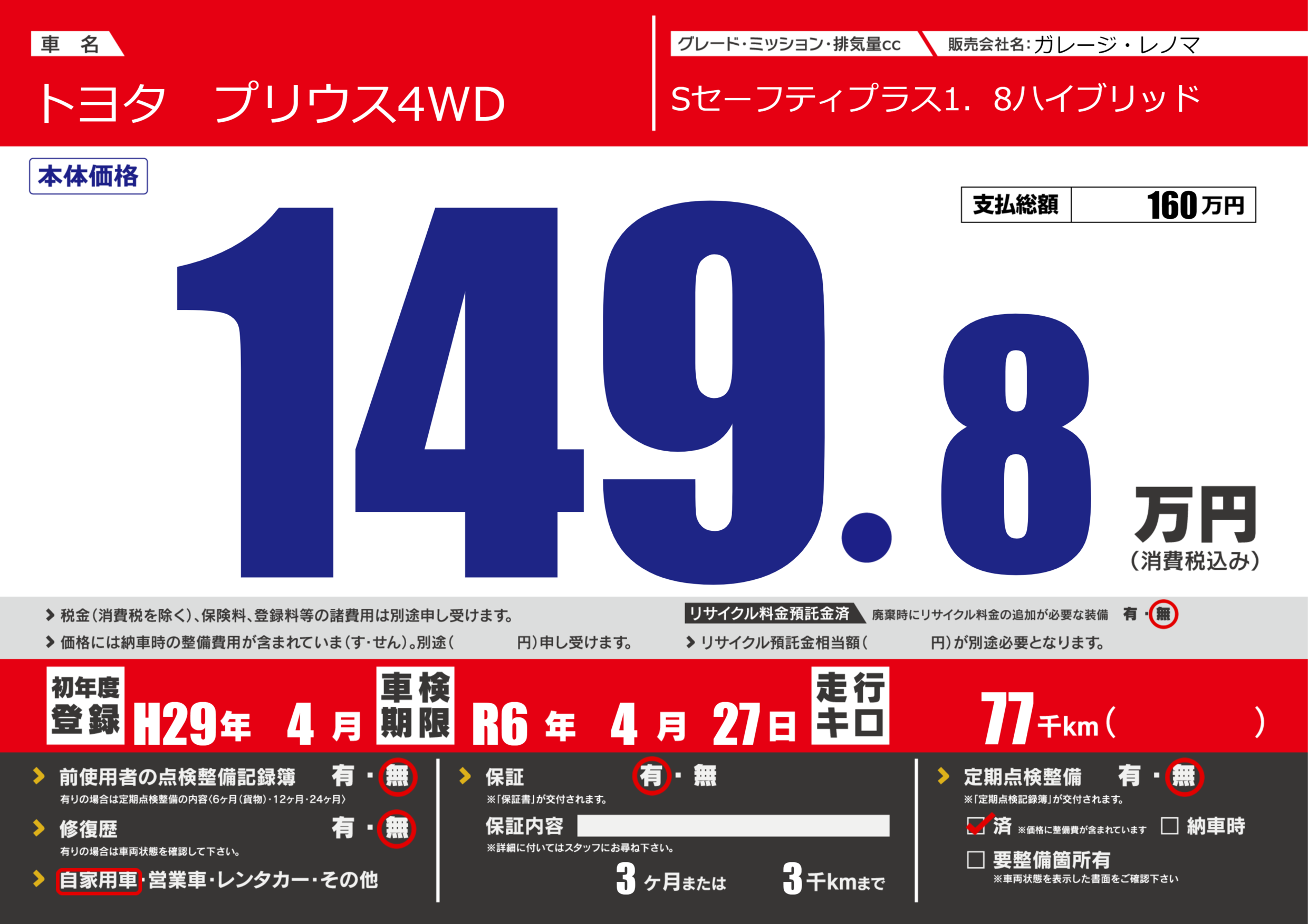 | 車名 | トヨタ プリウス4WD | グレード ミッション 排気量 |