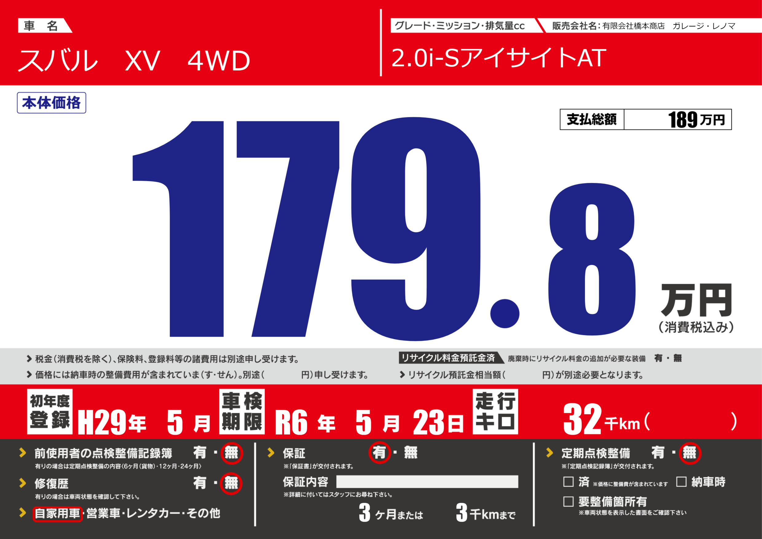 | 車名 | スバル XV 4WD | グレード ミッション 排気量 |