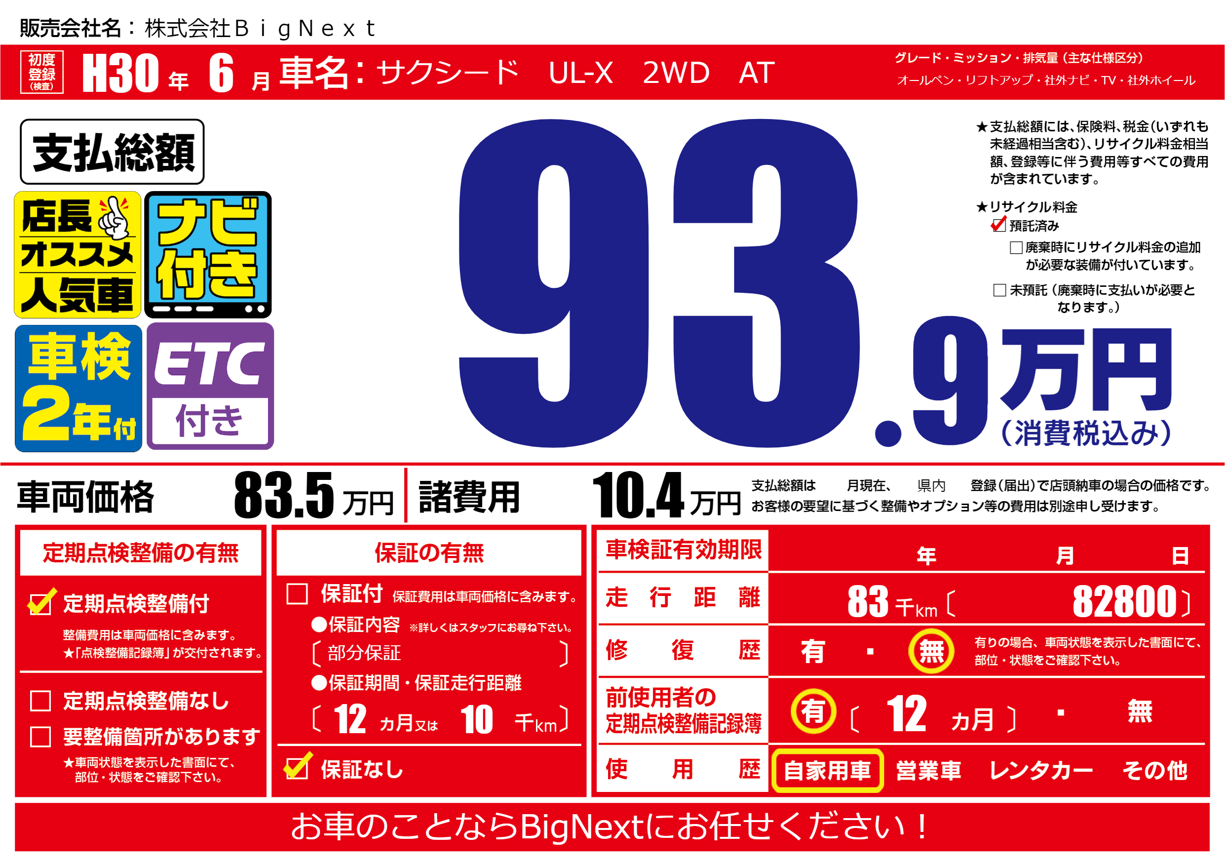 | 車名 | サクシード UL-X 2WD AT | グレード ミッション 排気量 |