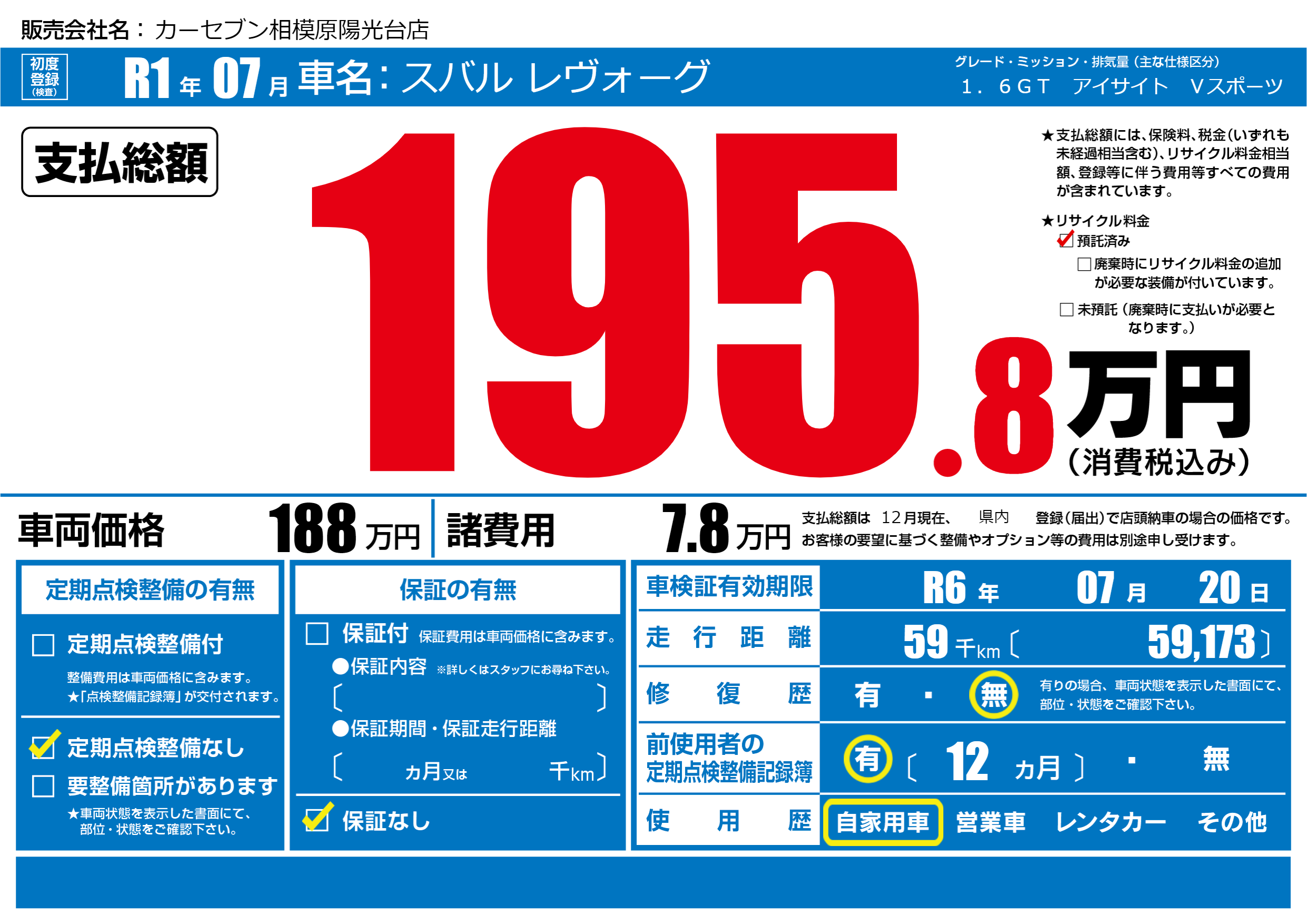 | 車名 | スバル レヴォーグ | グレード ミッション 排気量 |