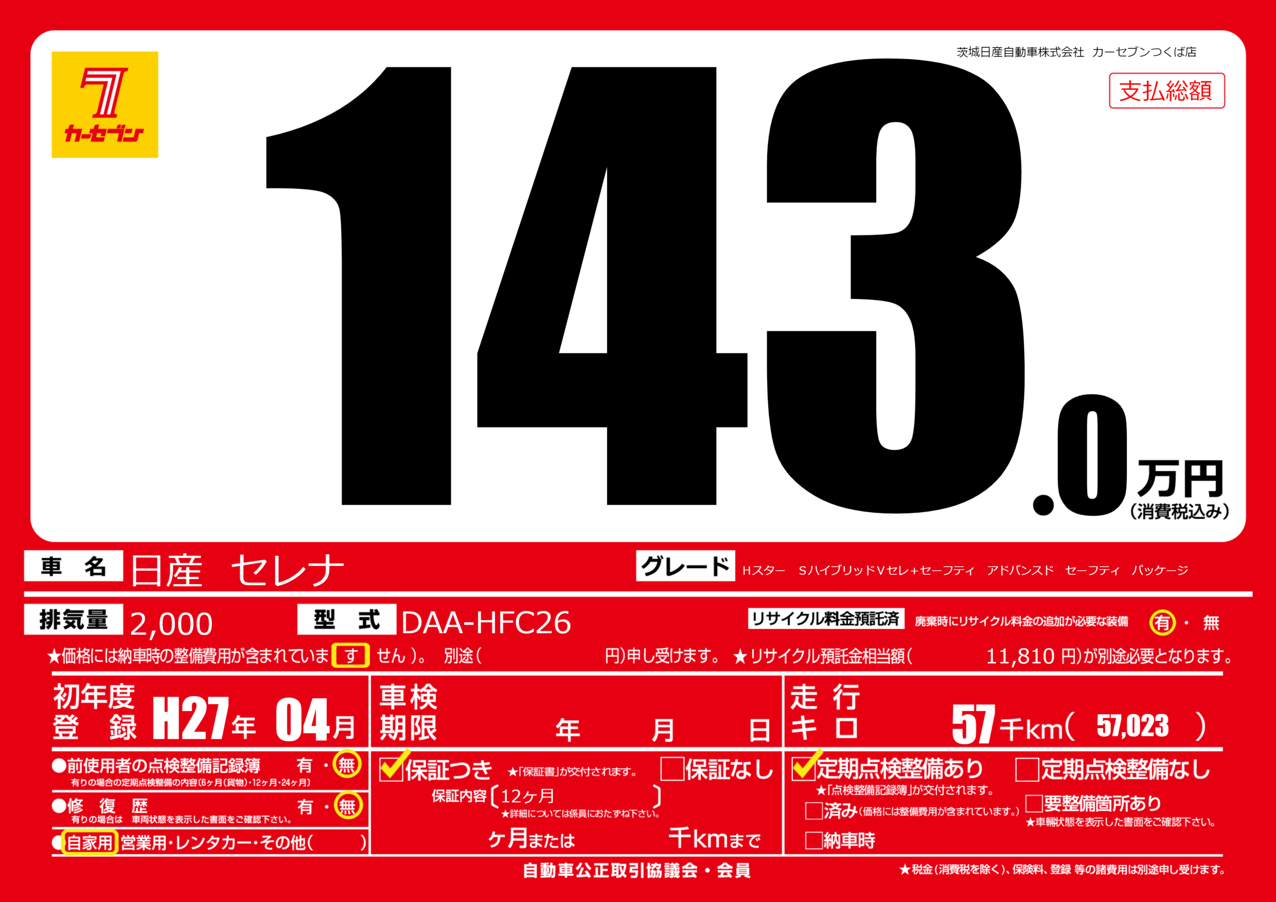 | 車名 | 日産 セレナ | グレード ミッション 排気量 |