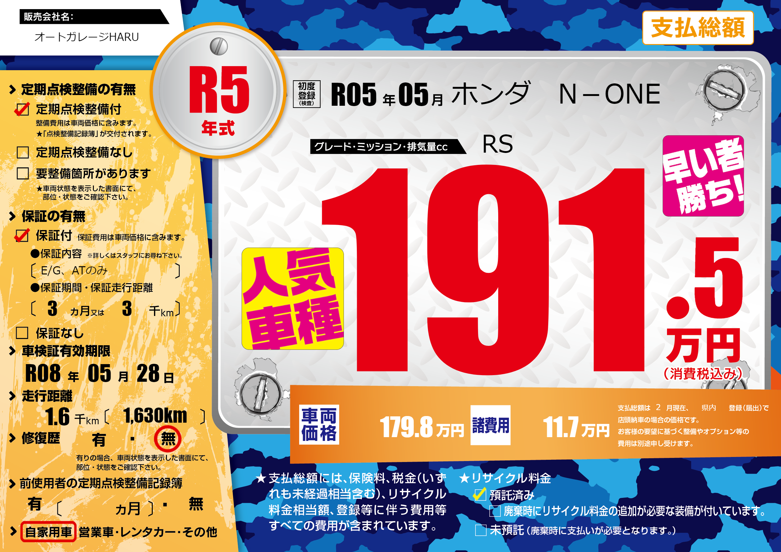 | 車名 | ホンダ N-ONE | グレード ミッション 排気量 |
