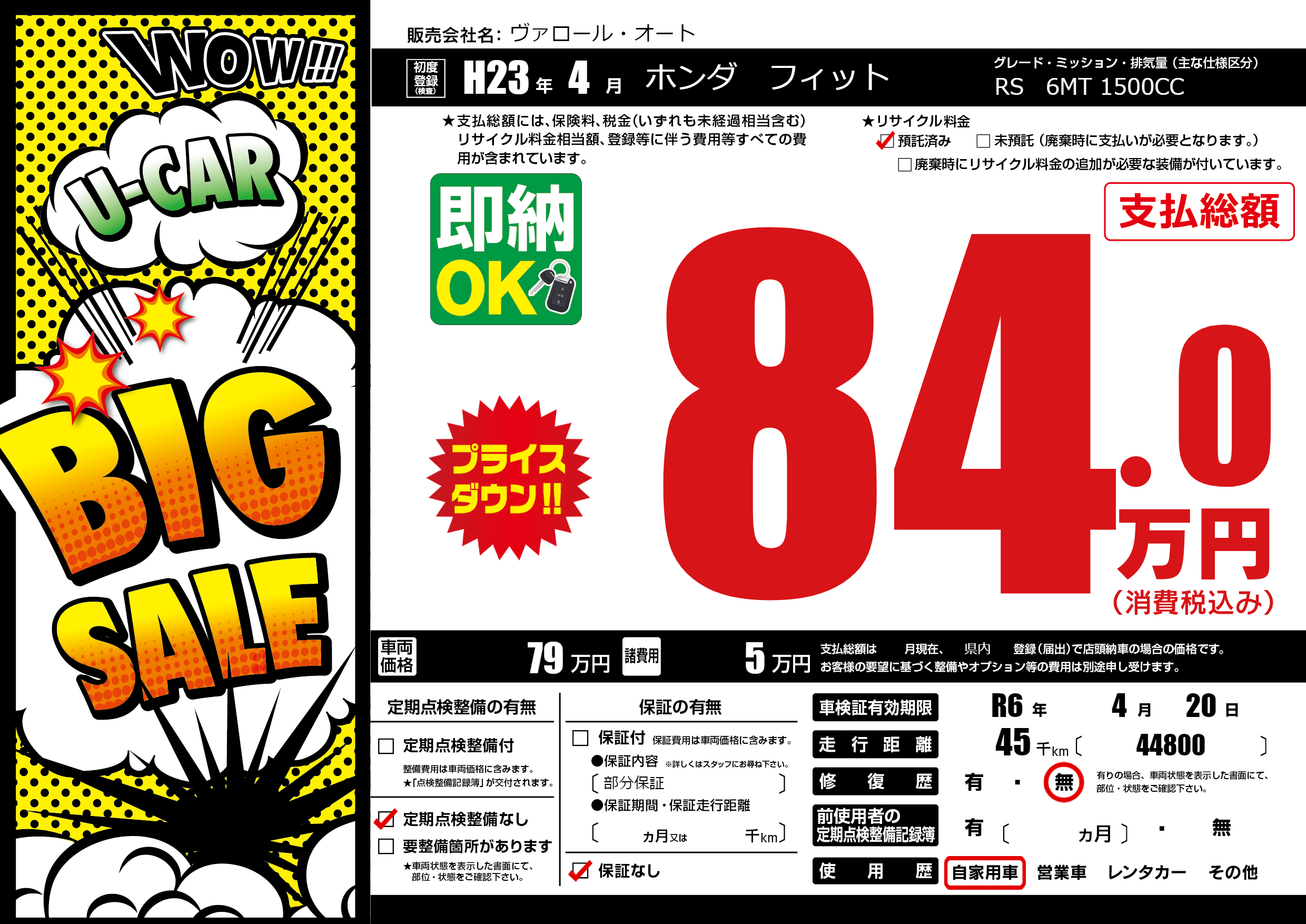 | 走行キロ | 4.5万km | 初年度登録 | H23年4月 |