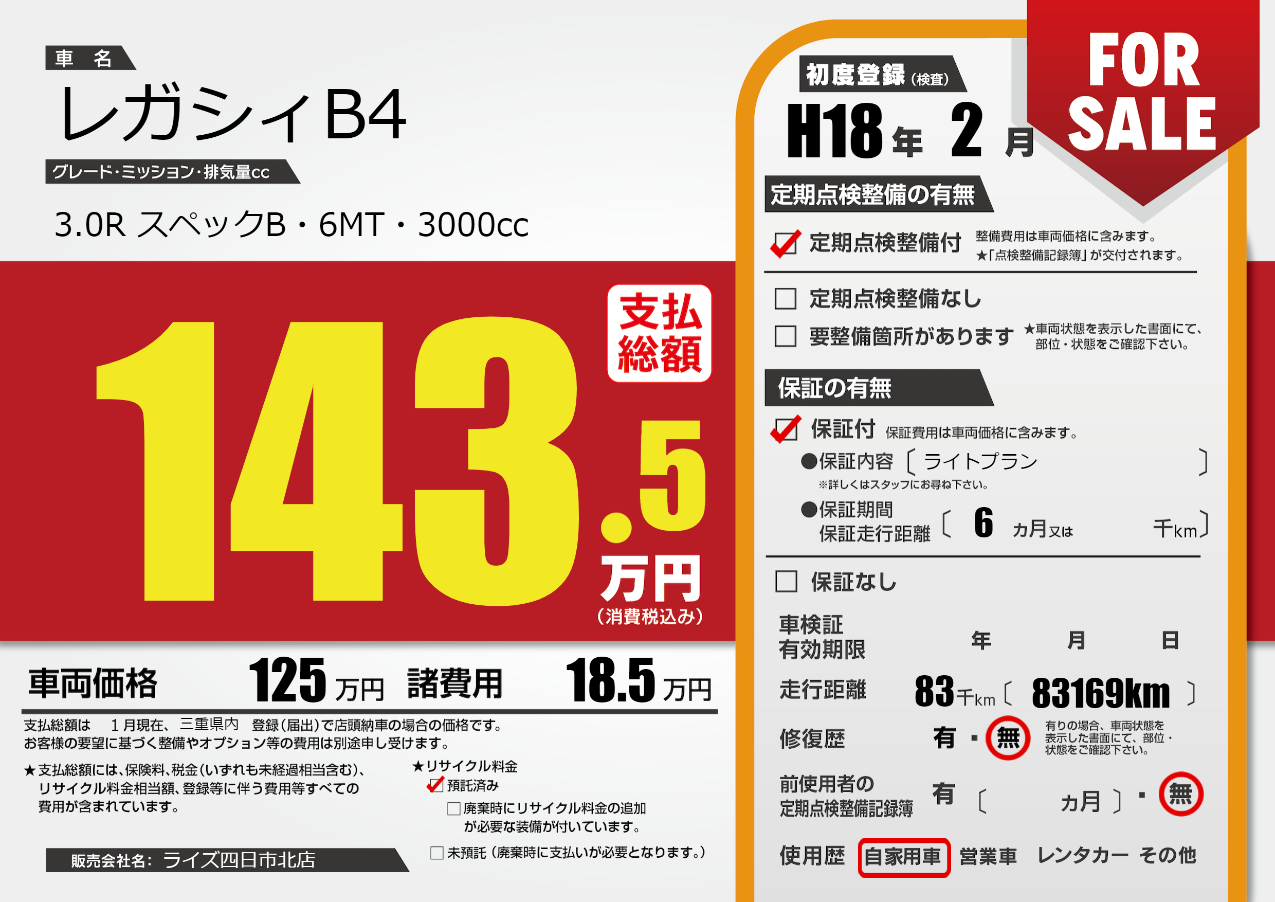 | 車名 | レガシィB4 | グレード ミッション 排気量 |