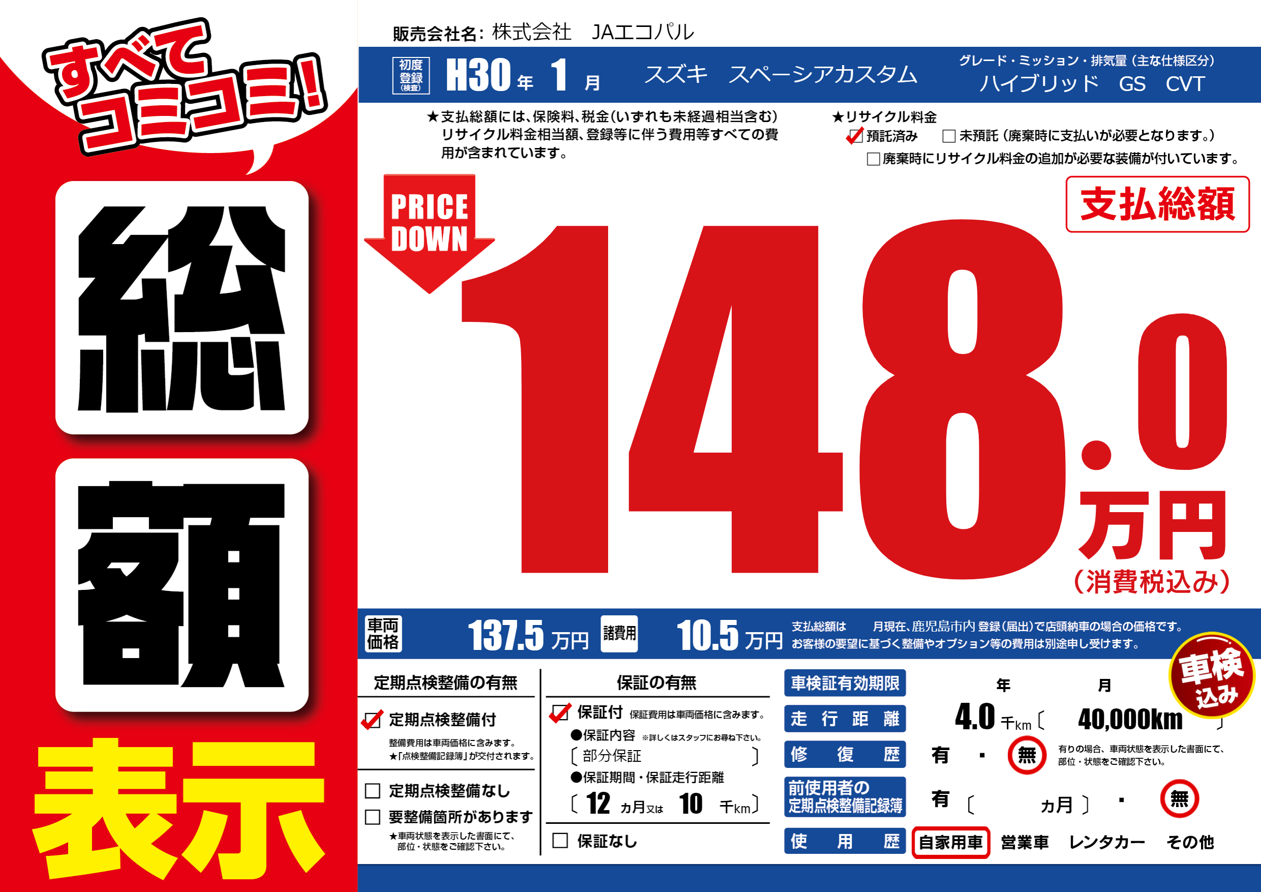 | 走行キロ | 0.4万km | 初年度登録 | H30年1月 |