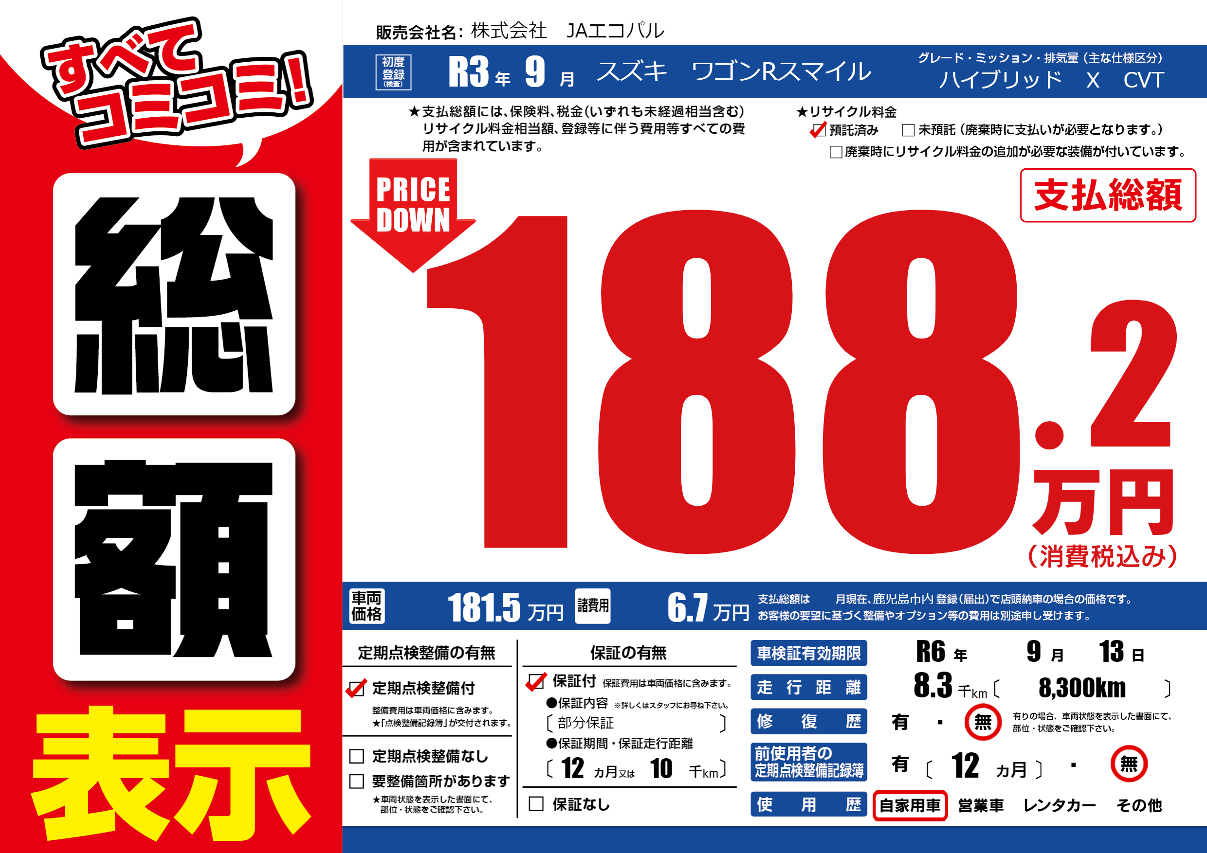 | 走行キロ | 0.8万km | 初年度登録 | R3年9月 |