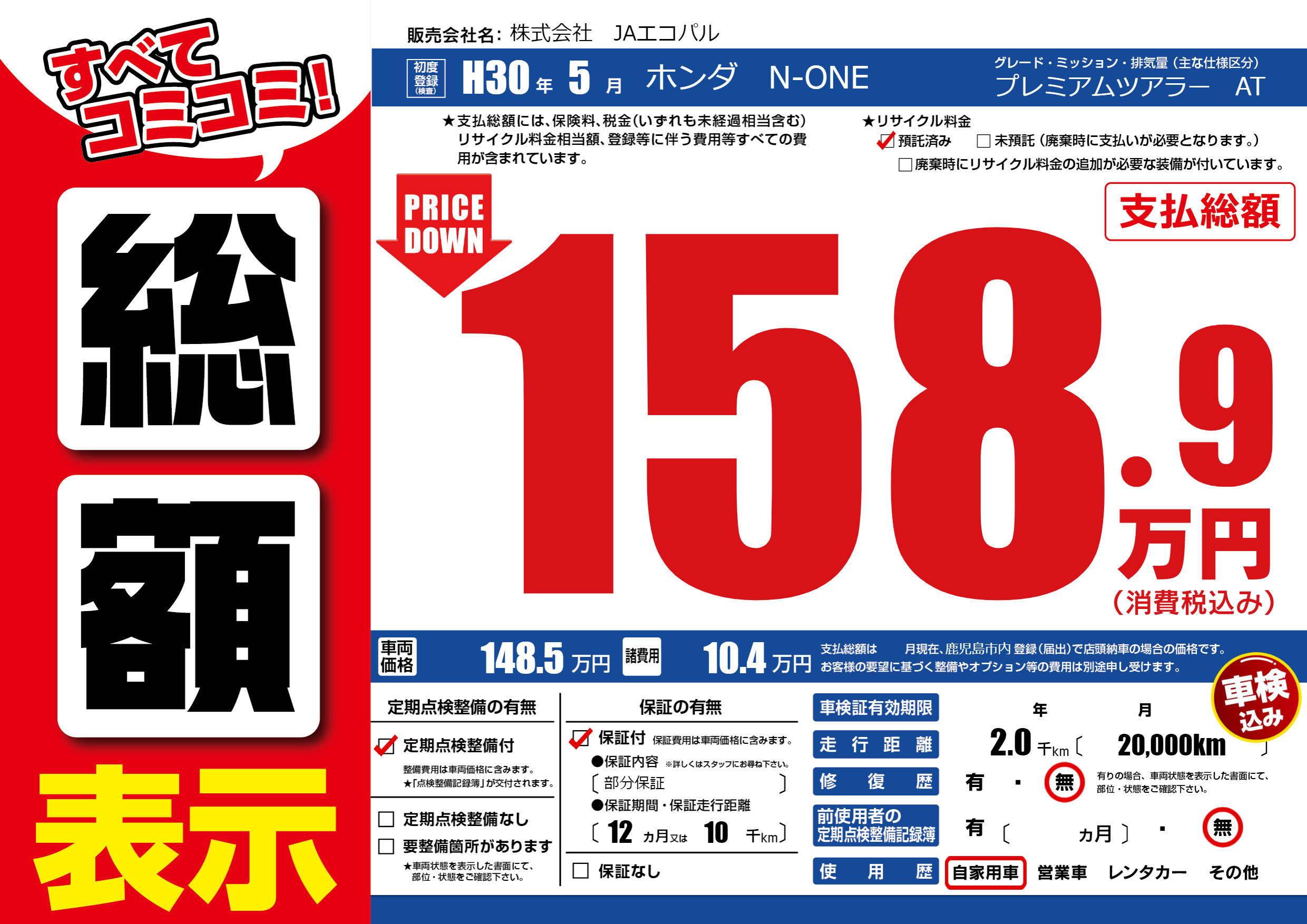 | 車名 | ホンダ N-ONE | グレード ミッション 排気量 |