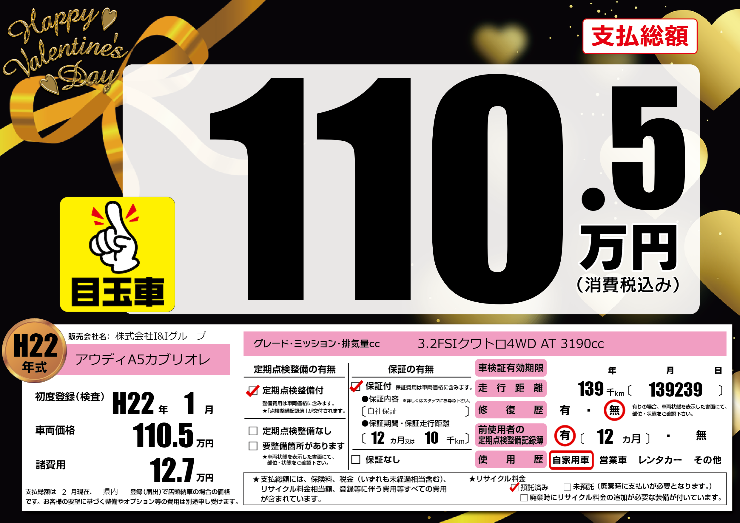 | 車名 | アウディA5カブリオレ | グレード ミッション 排気量 |
