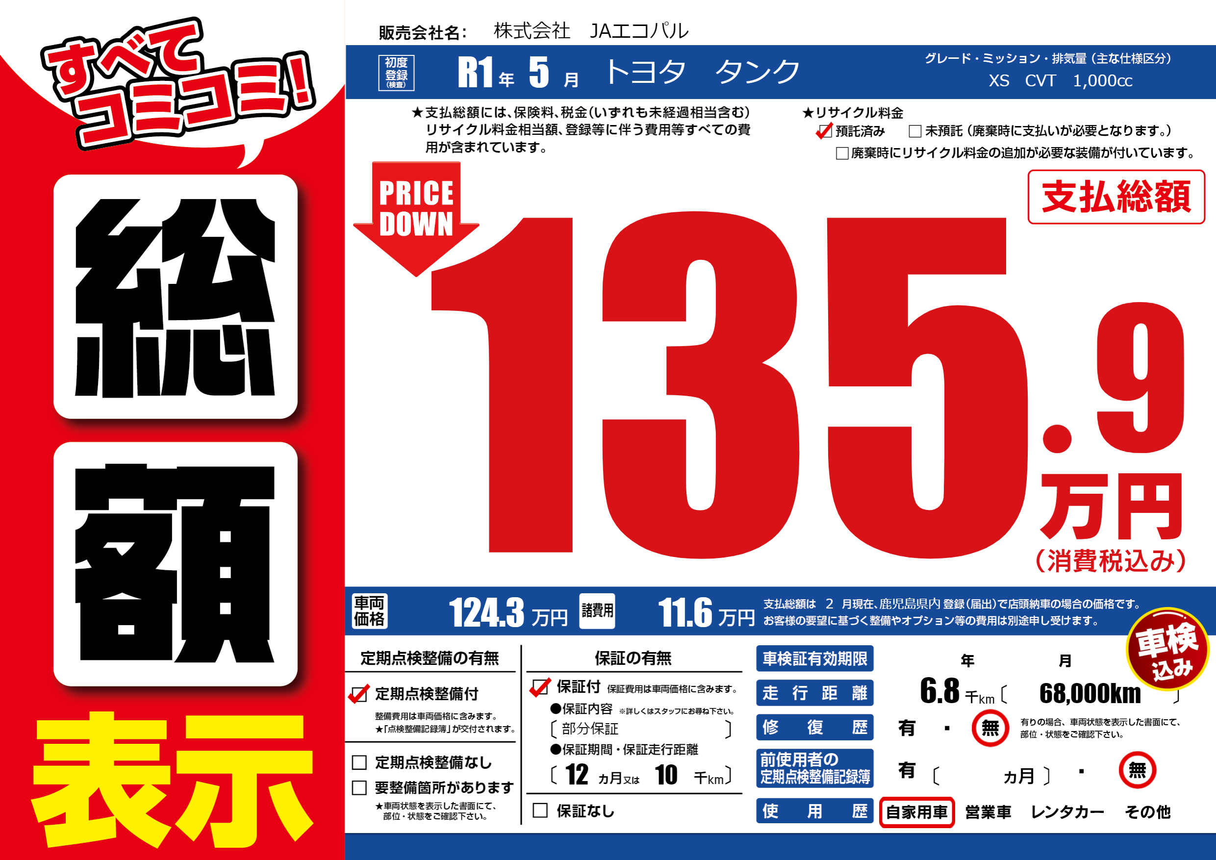 | 車名 | トヨタ タンク | グレード ミッション 排気量 |