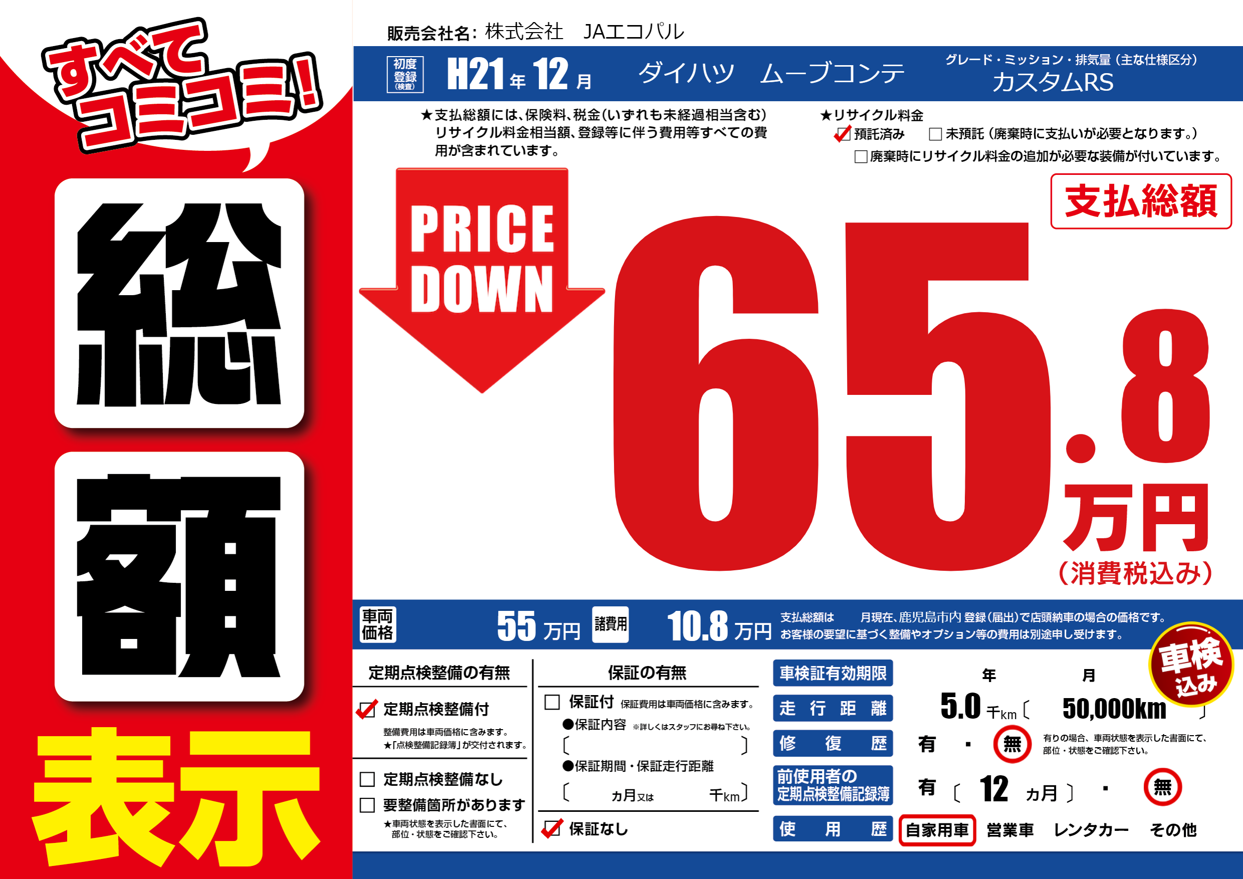 | 走行キロ | 0.5万km | 初年度登録 | H21年12月 |