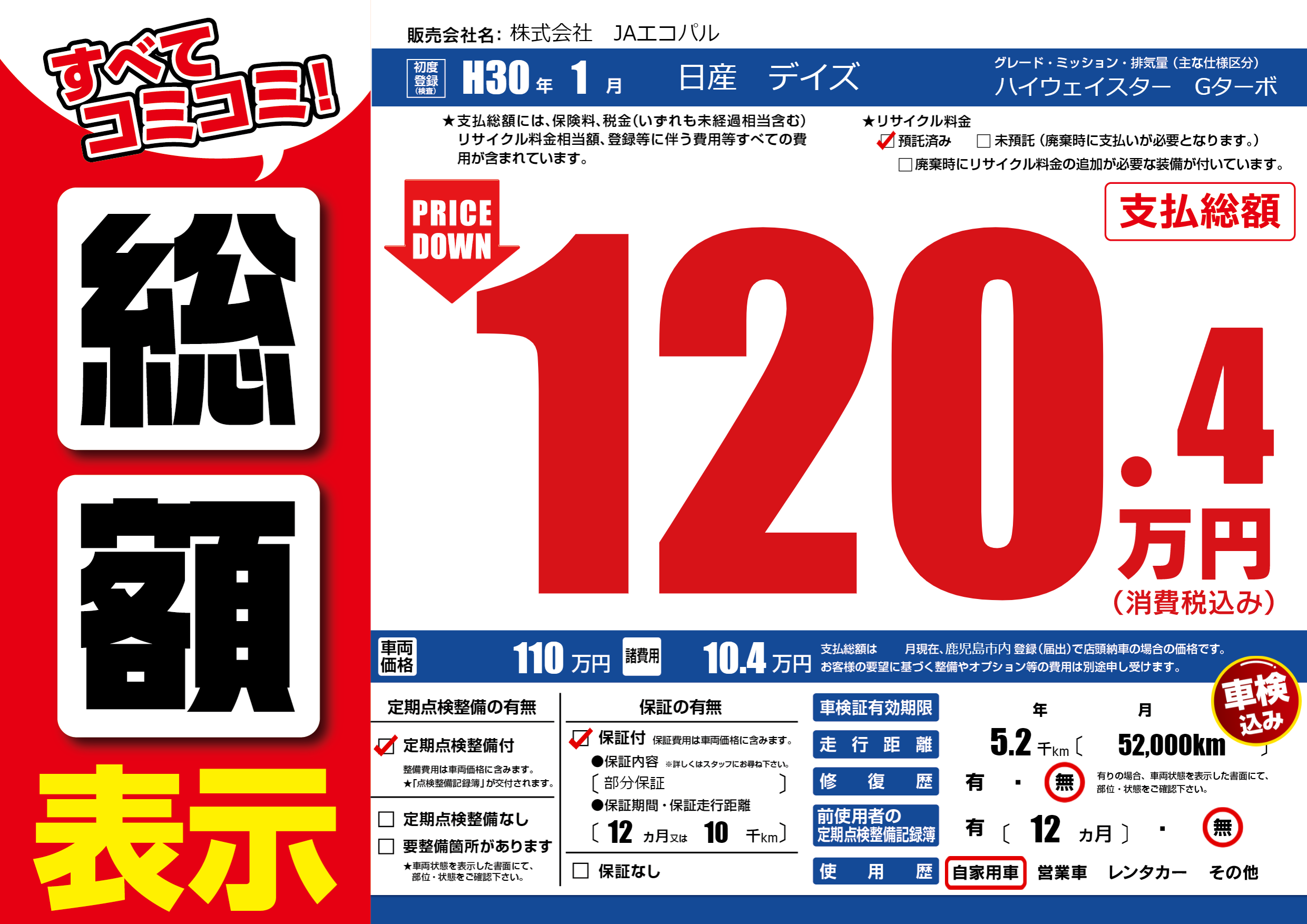 | 車名 | 日産 デイズ | グレード ミッション 排気量 |