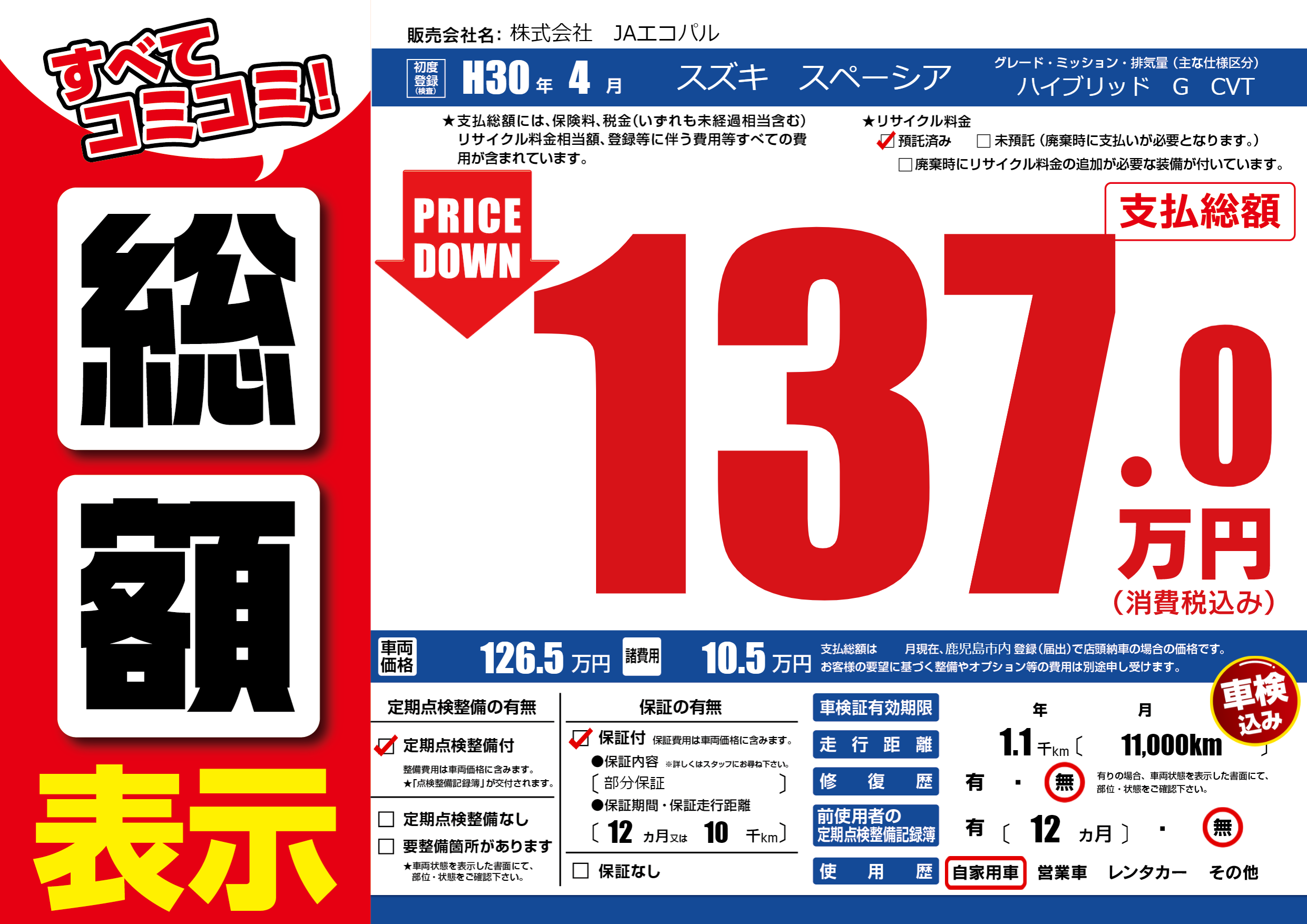 | 走行キロ | 0.1万km | 初年度登録 | H30年4月 |