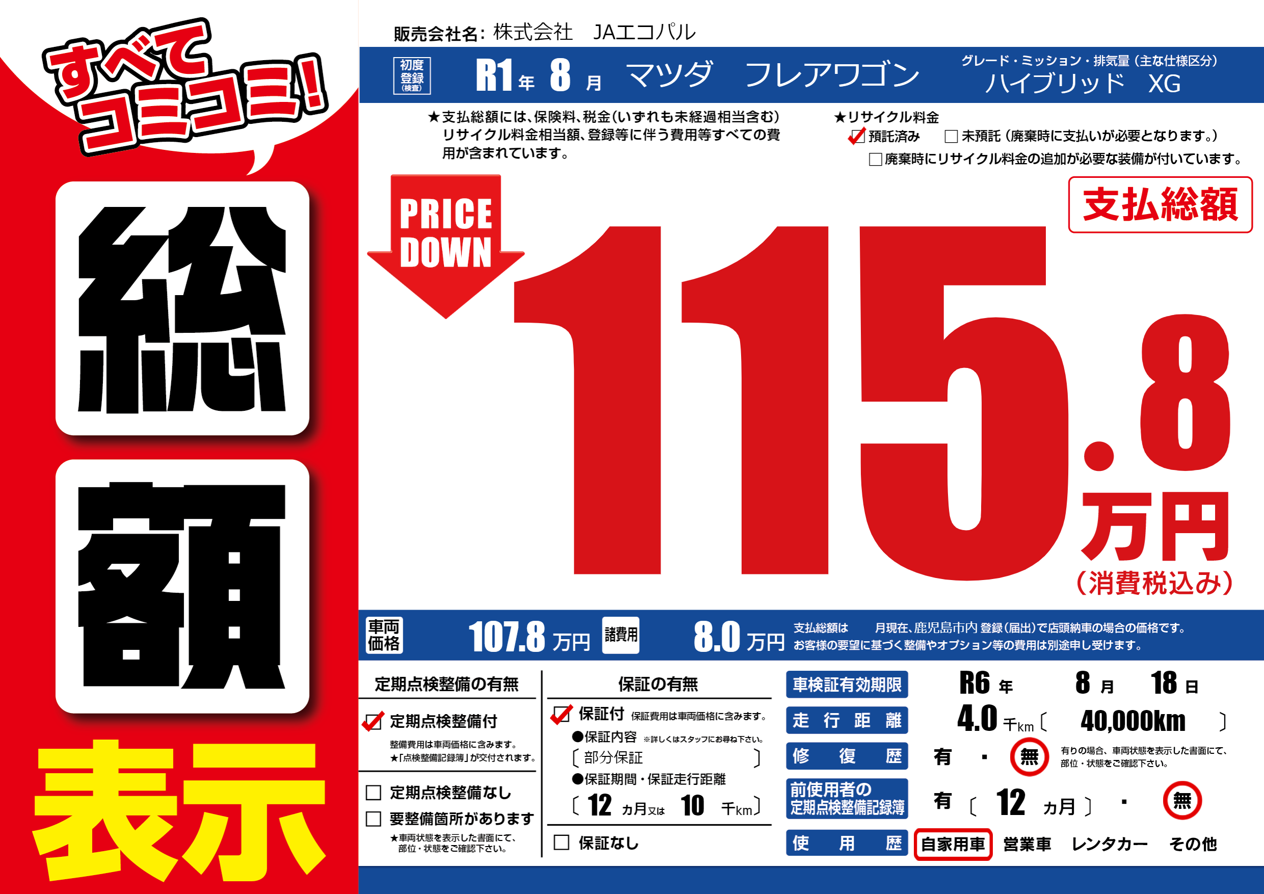 | 車名 | マツダ フレアワゴン | グレード ミッション 排気量 |