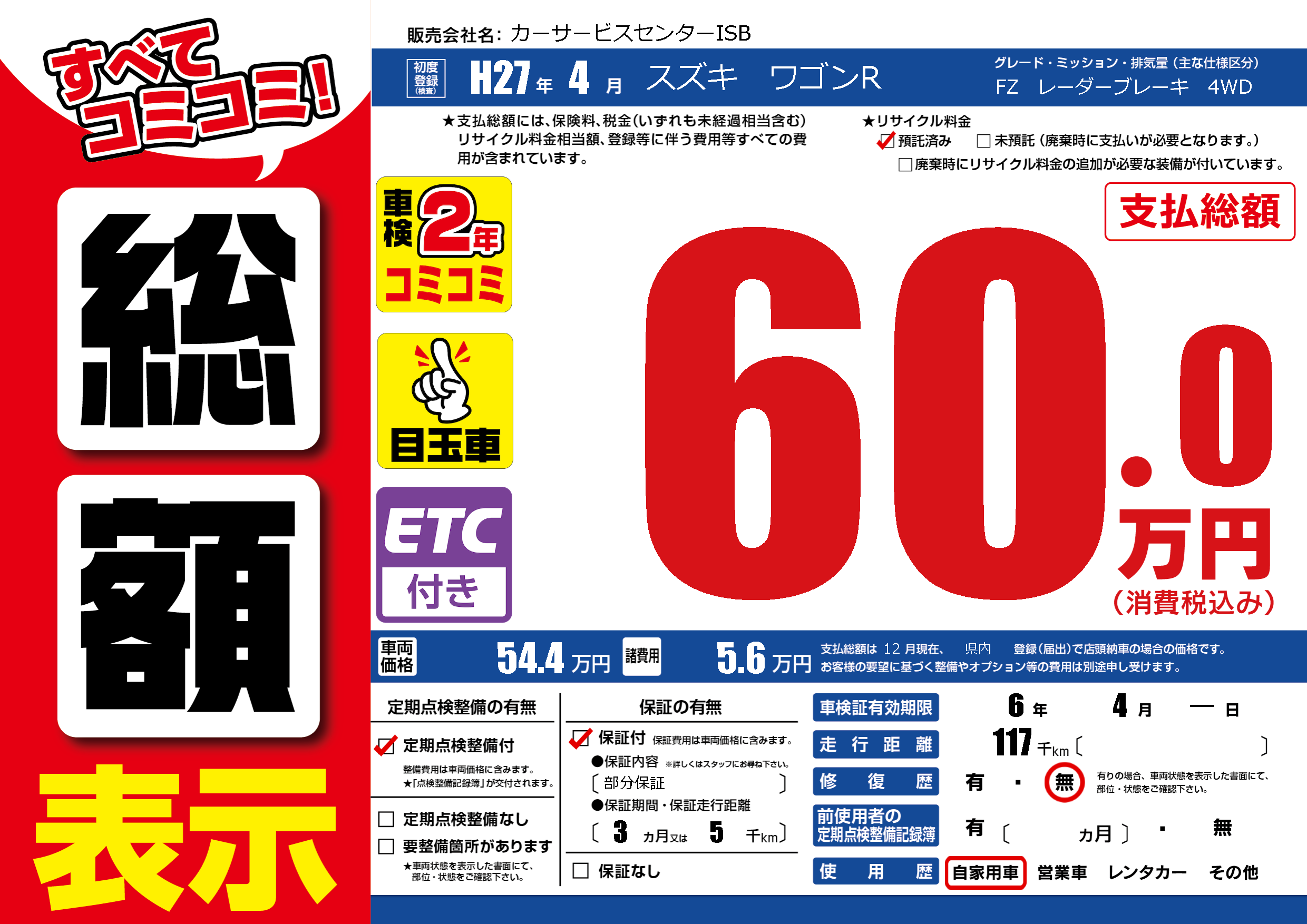| 車名 | スズキ ワゴンR | グレード ミッション 排気量 |