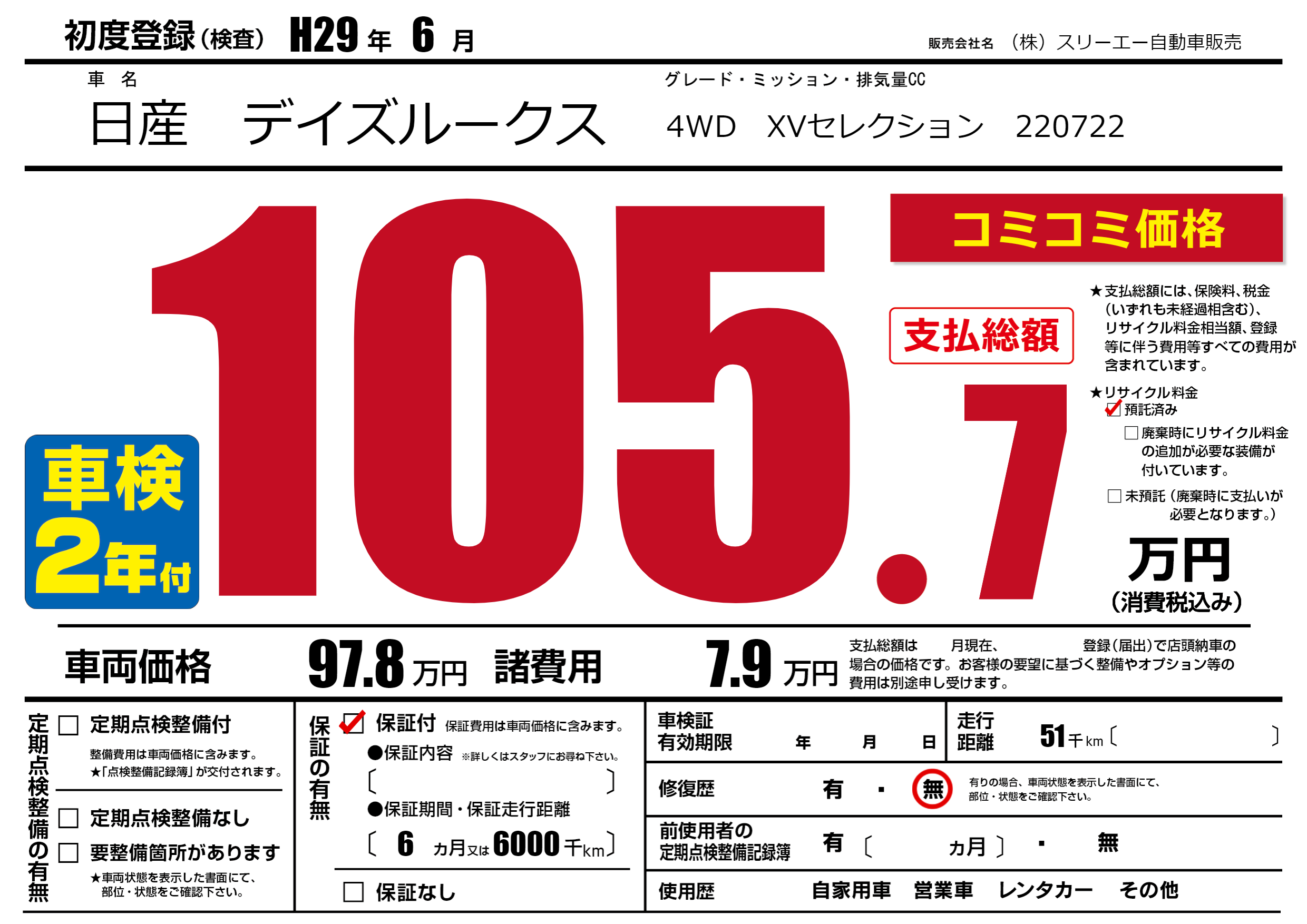 | 走行キロ | 5.1万km | 初年度登録 | H29年6月 |