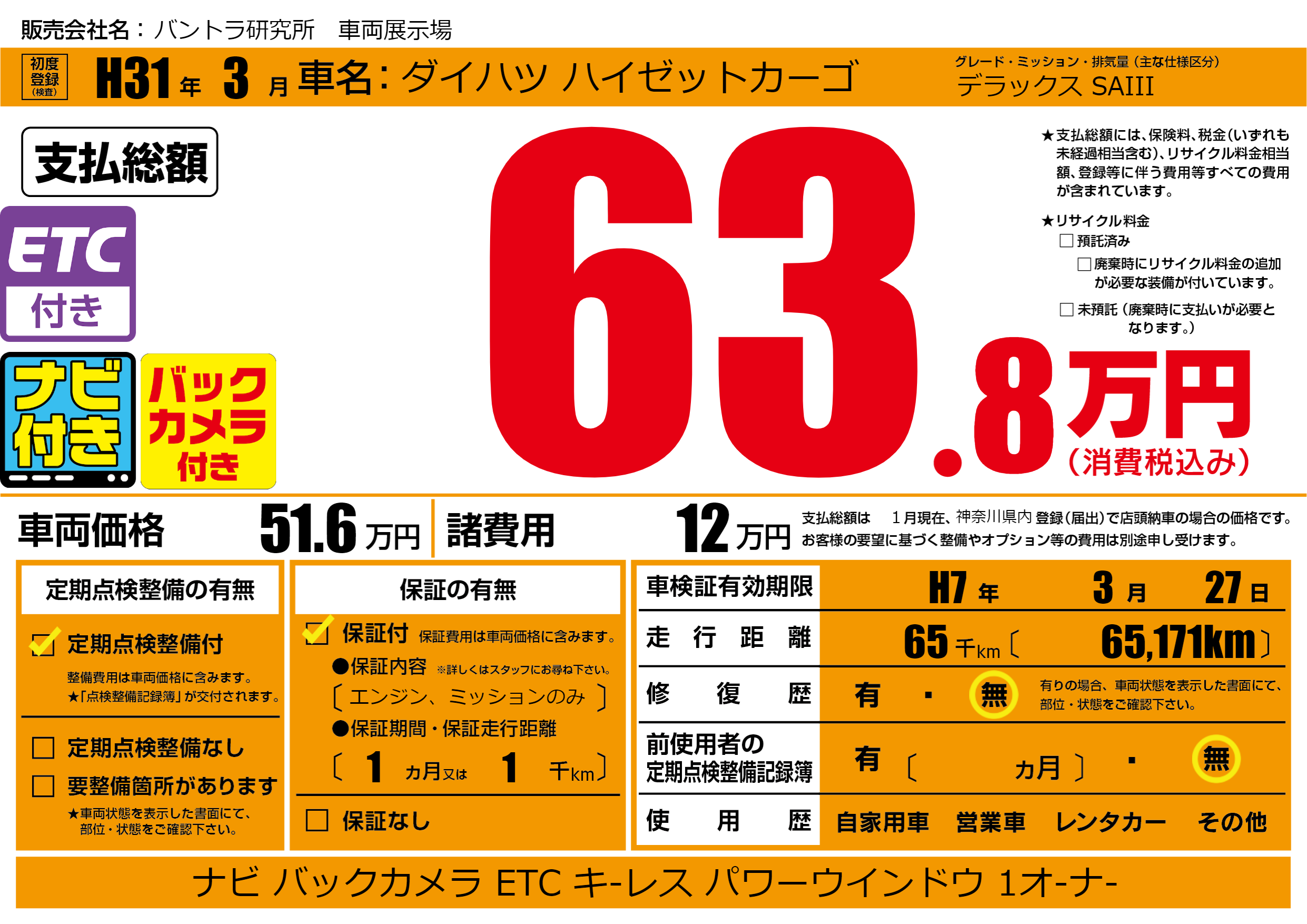 | 車名 | ダイハツ ハイゼットカーゴ | グレード ミッション 排気量 |