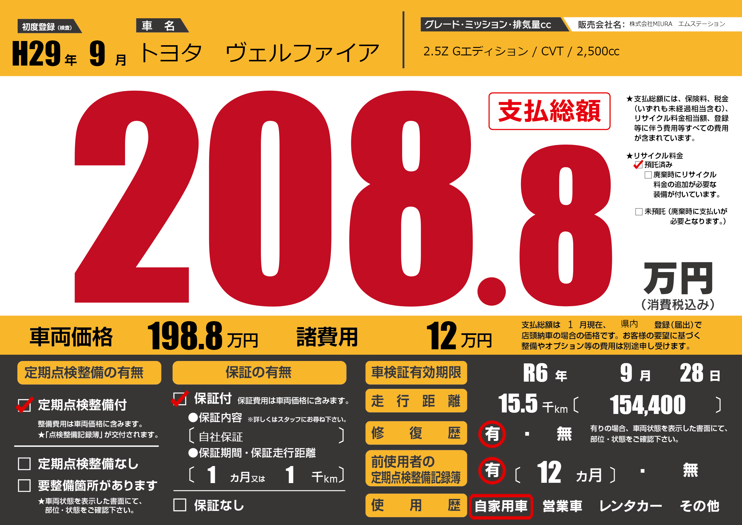| 車名 | トヨタ ヴェルファイア | グレード ミッション 排気量 |