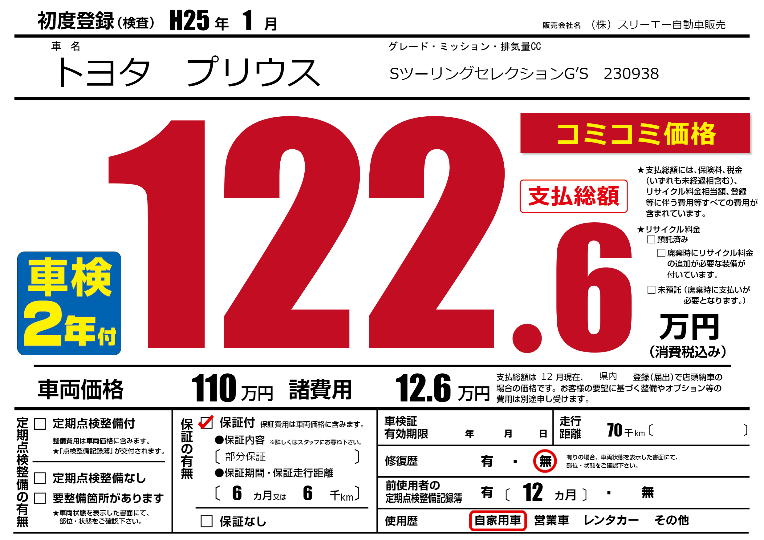 | 車名 | トヨタ プリウス | グレード ミッション 排気量 |