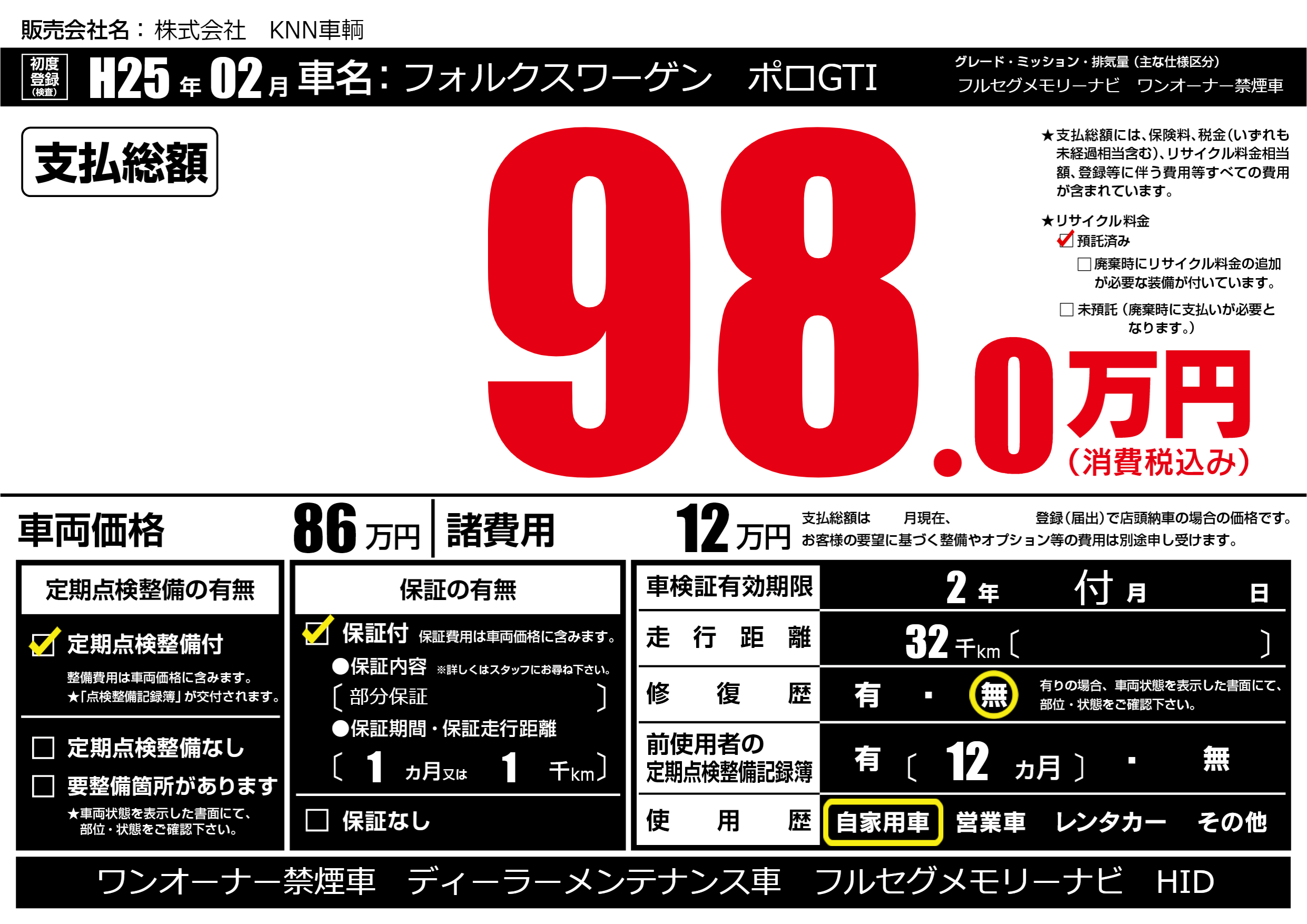 | 車名 | フォルクスワーゲン ポロGTI | グレード ミッション 排気量 |