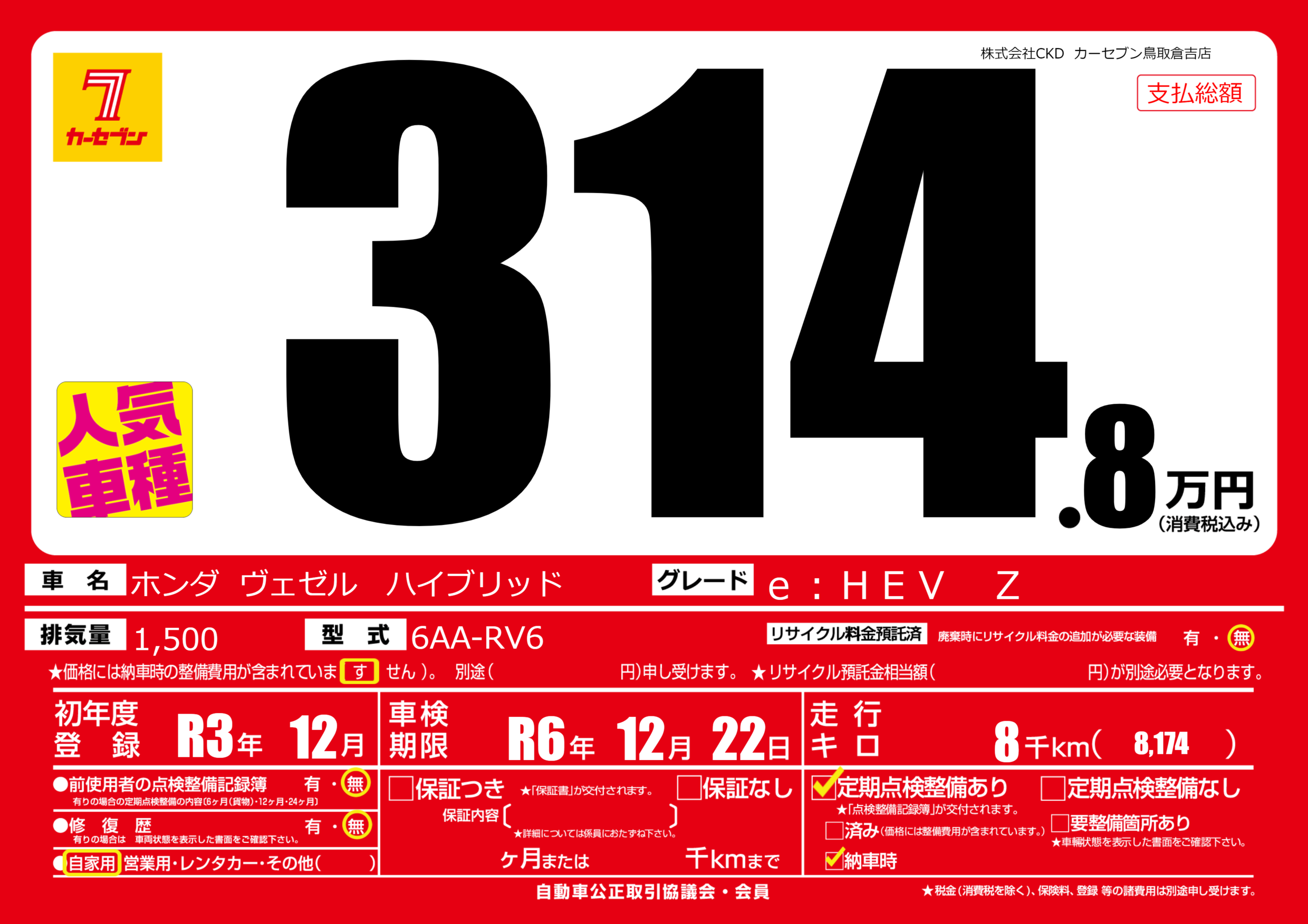 | 走行キロ | 0.8万km | 初年度登録 | R3年12月 |