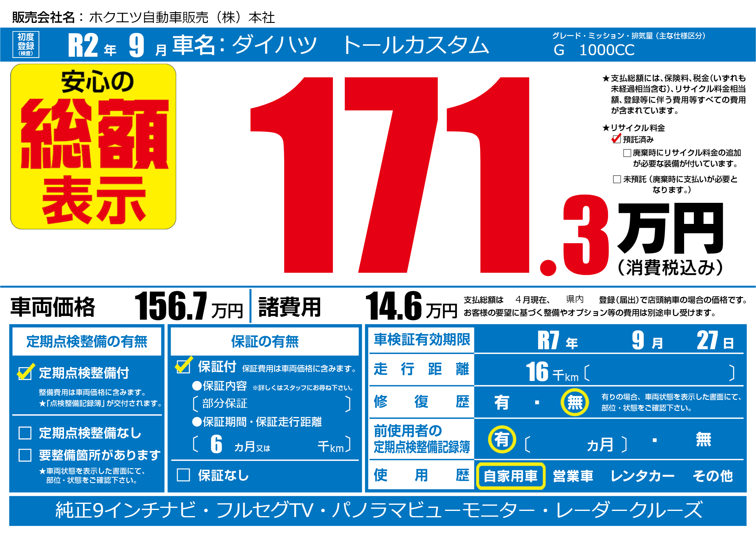なし | 車検制限 | R7年9月27月 |