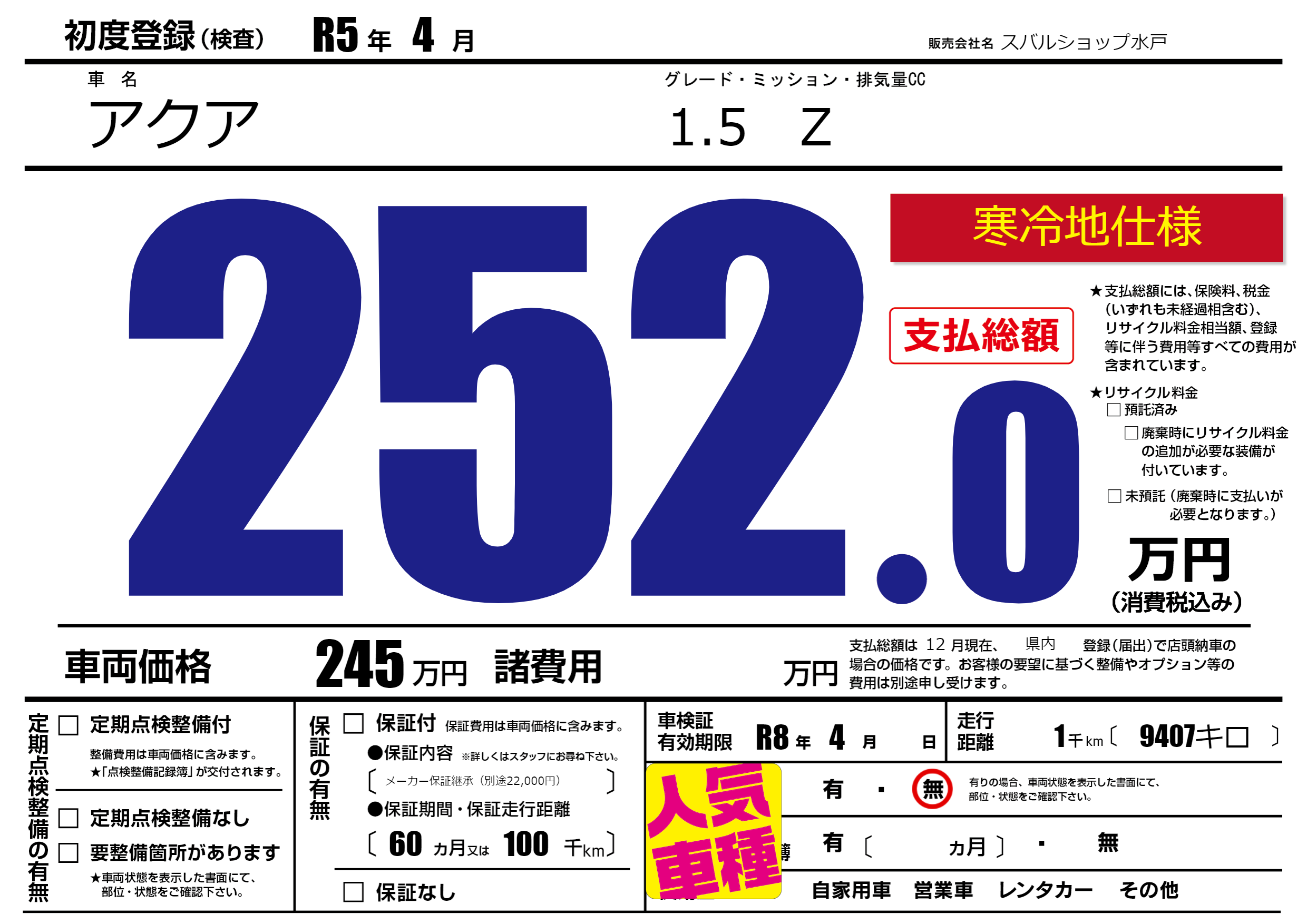 なし | リサイクル預託金相当額 | ( 0円)が別途必要 |