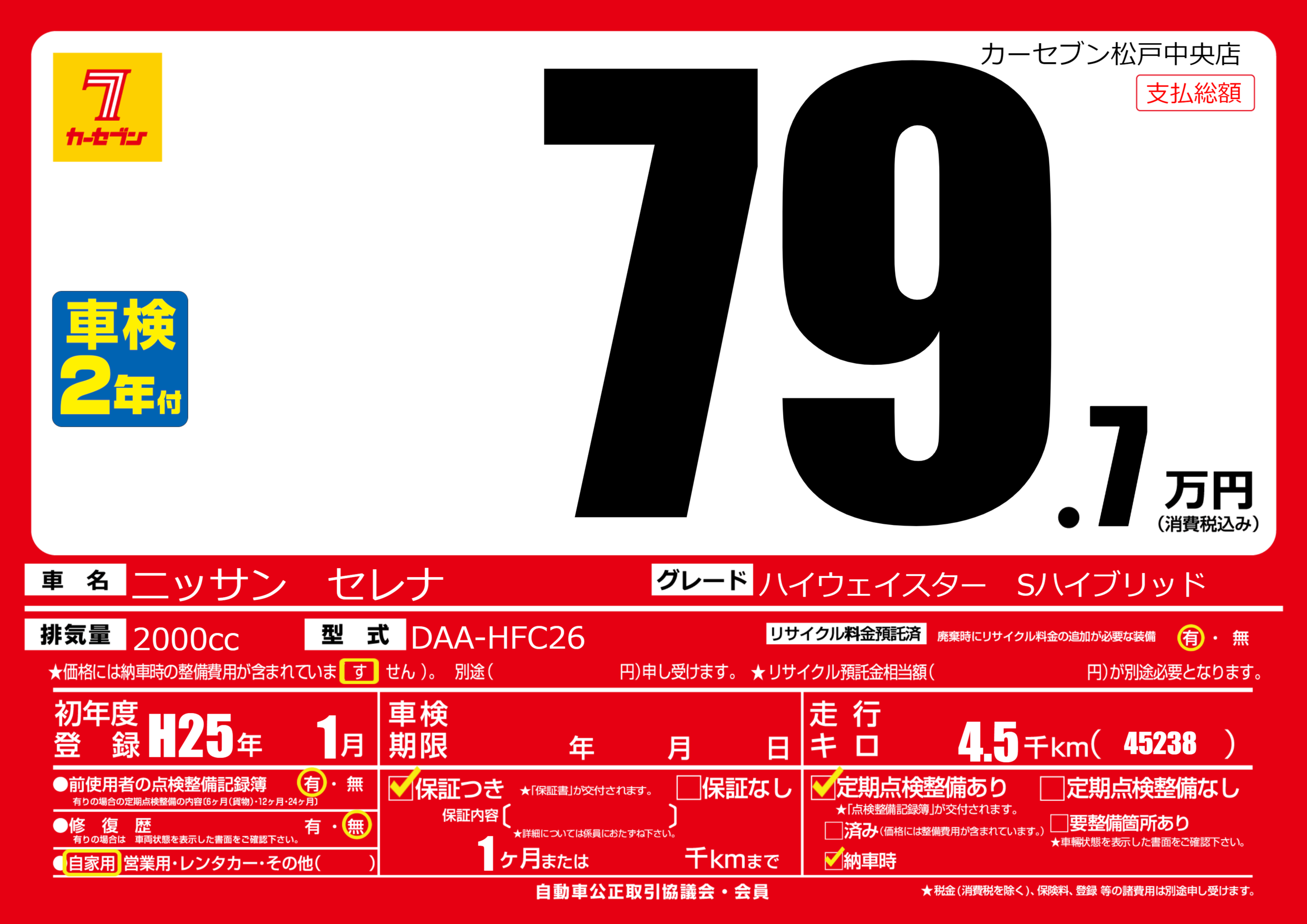 | 定期点検整備 | 定期点検整備あり 納車時あり | ||