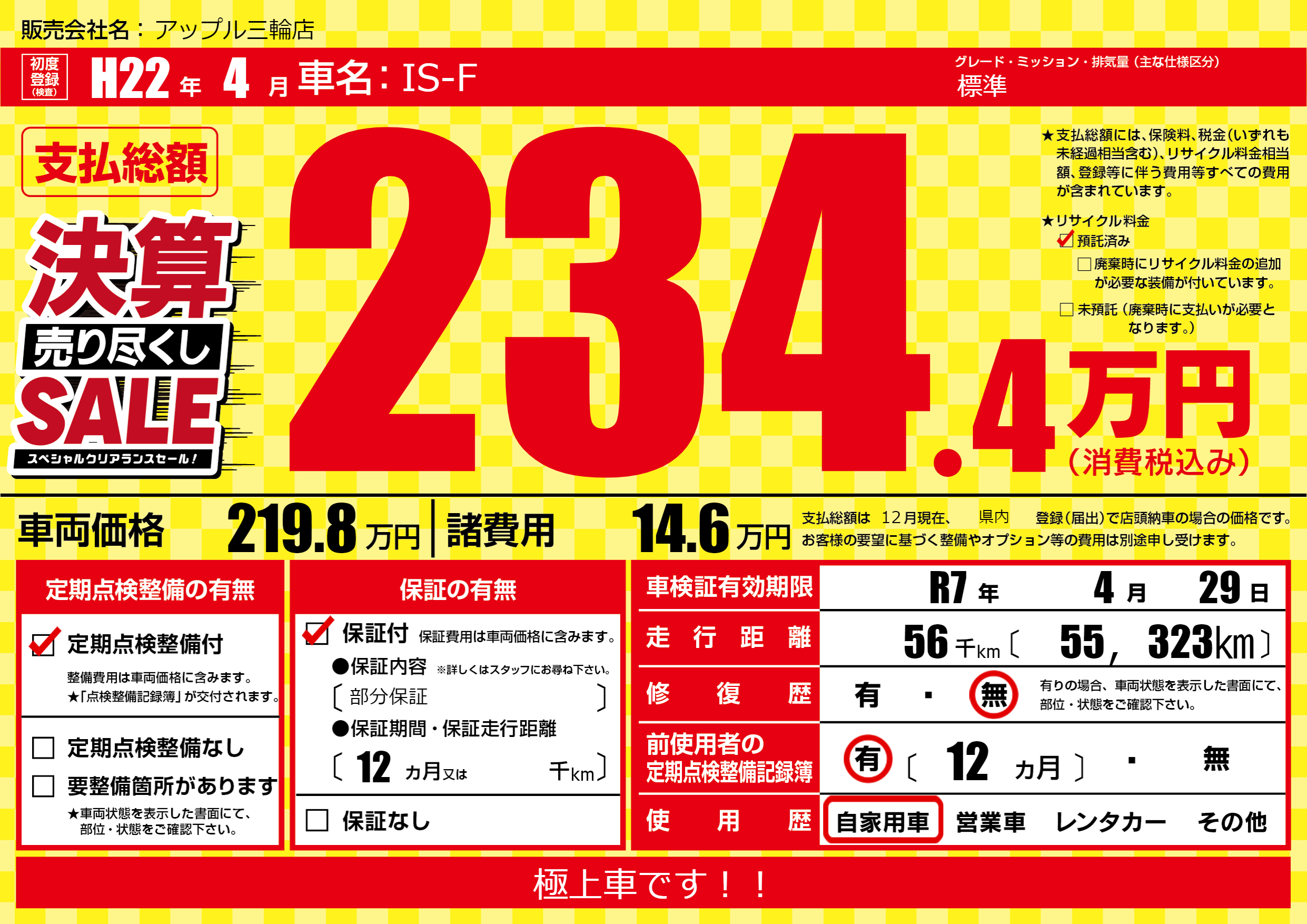 | 車名 | IS-F | グレード ミッション 排気量 |