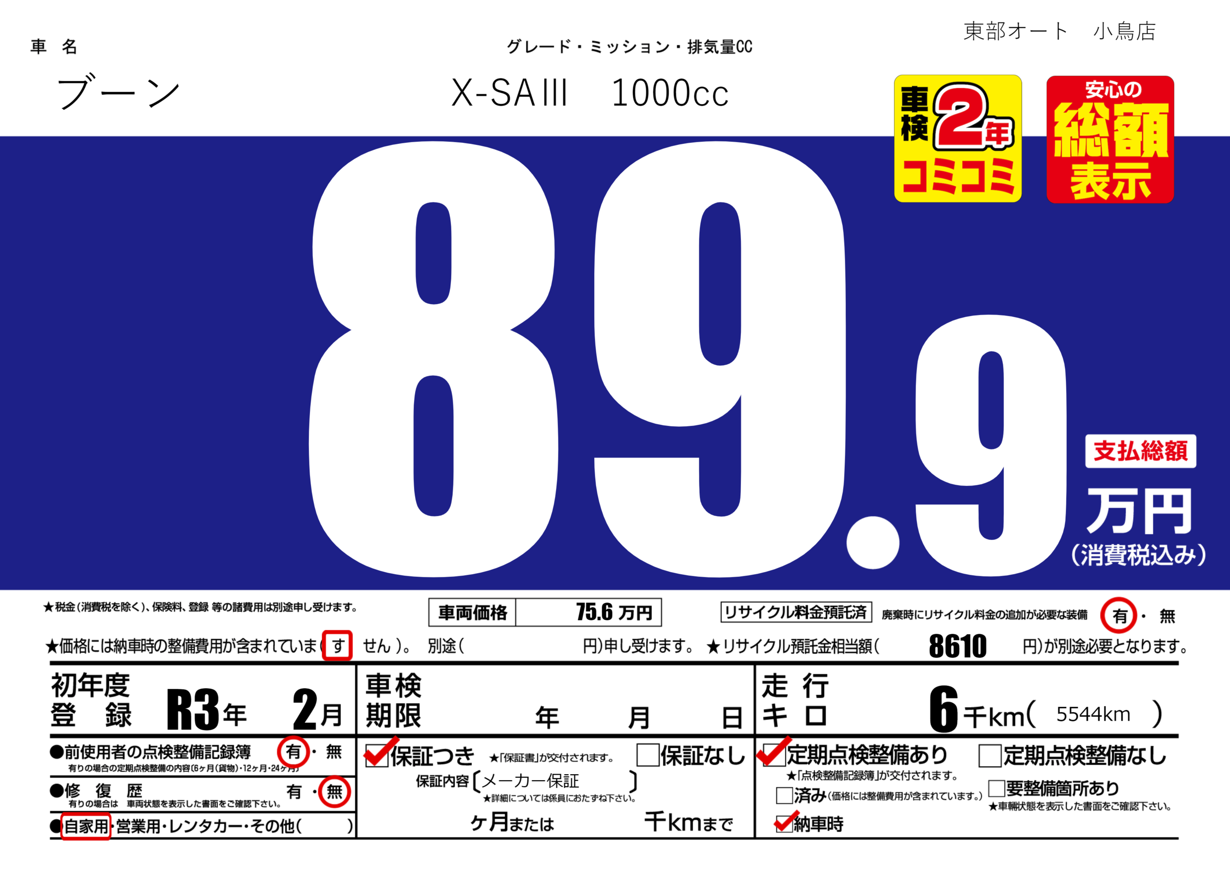 | 車名 | ブーン | グレード ミッション 排気量 |