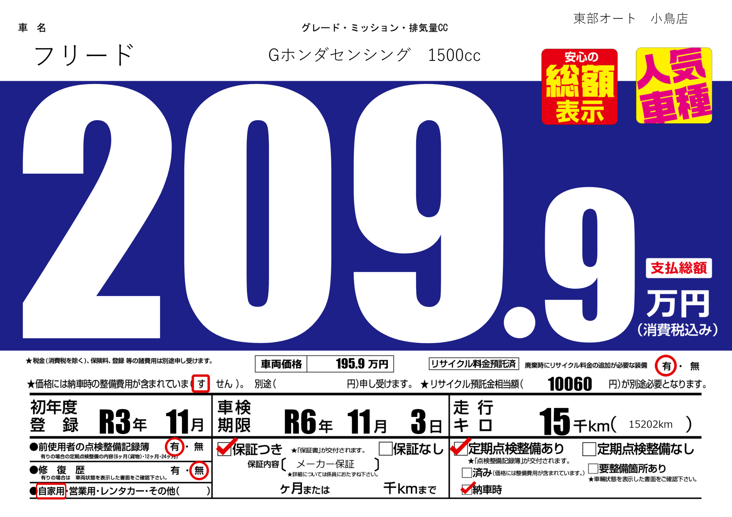 保証付き 保証内容( メーカー保証) ---ヶ月または()千kmまで |