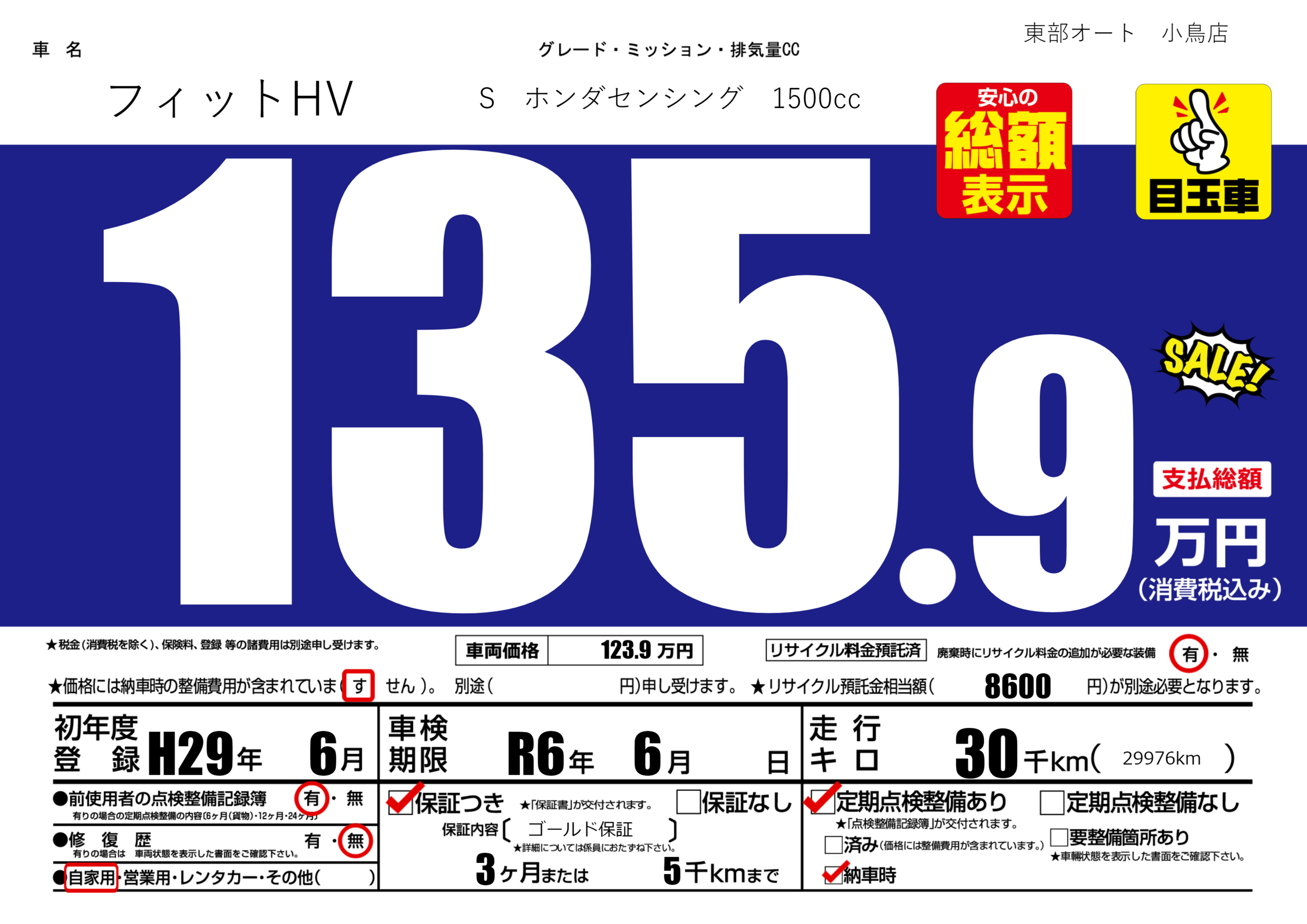 | 走行キロ | 3万km | 初年度登録 | H29年6月 |