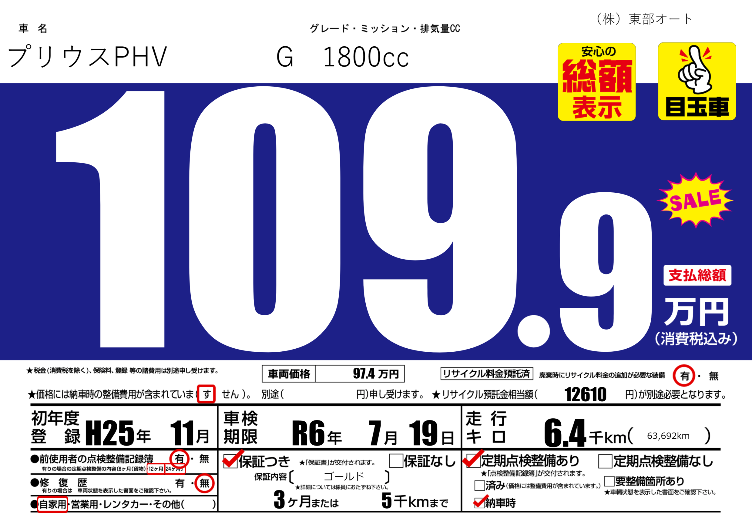 | 車名 | プリウスPHV | グレード ミッション 排気量 |
