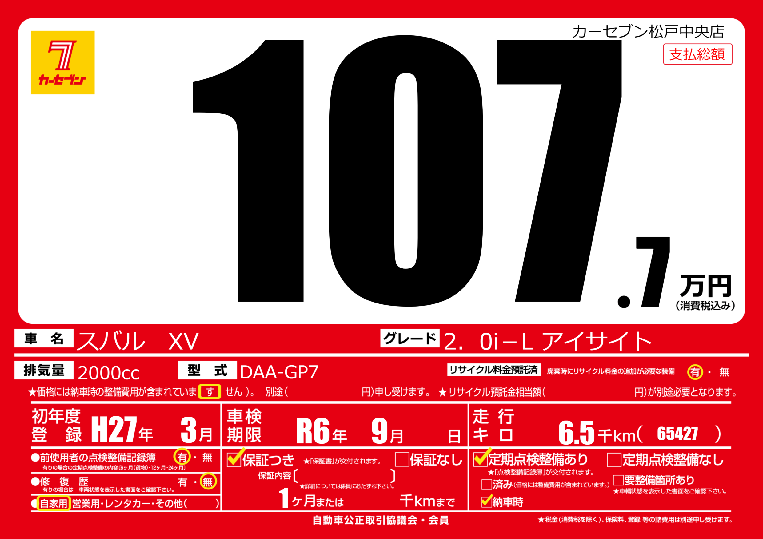 | 車検制限 | R6年 9月 - 日 | ||