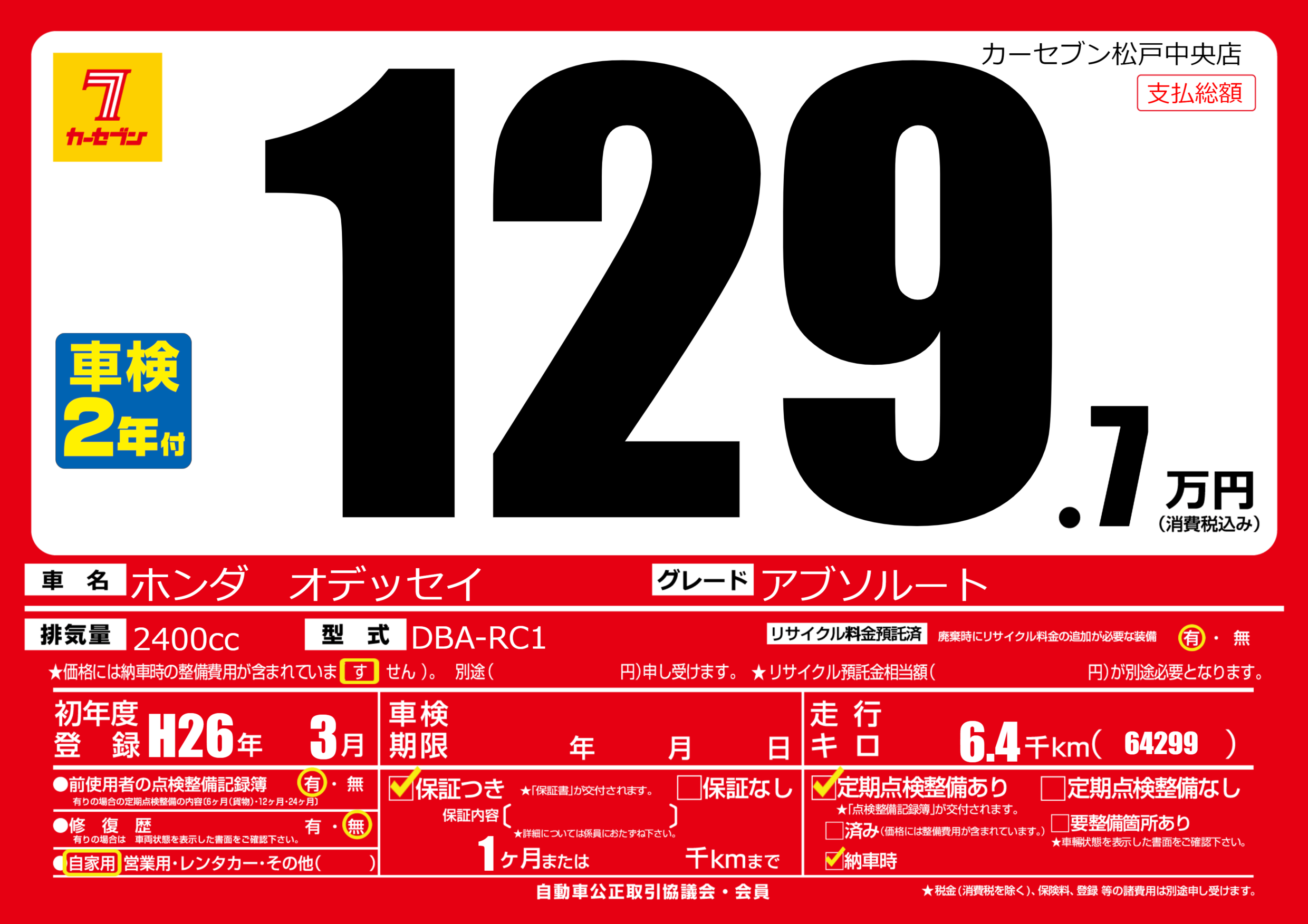 | 車名 | ホンダ オデッセイ | グレード ミッション 排気量 |