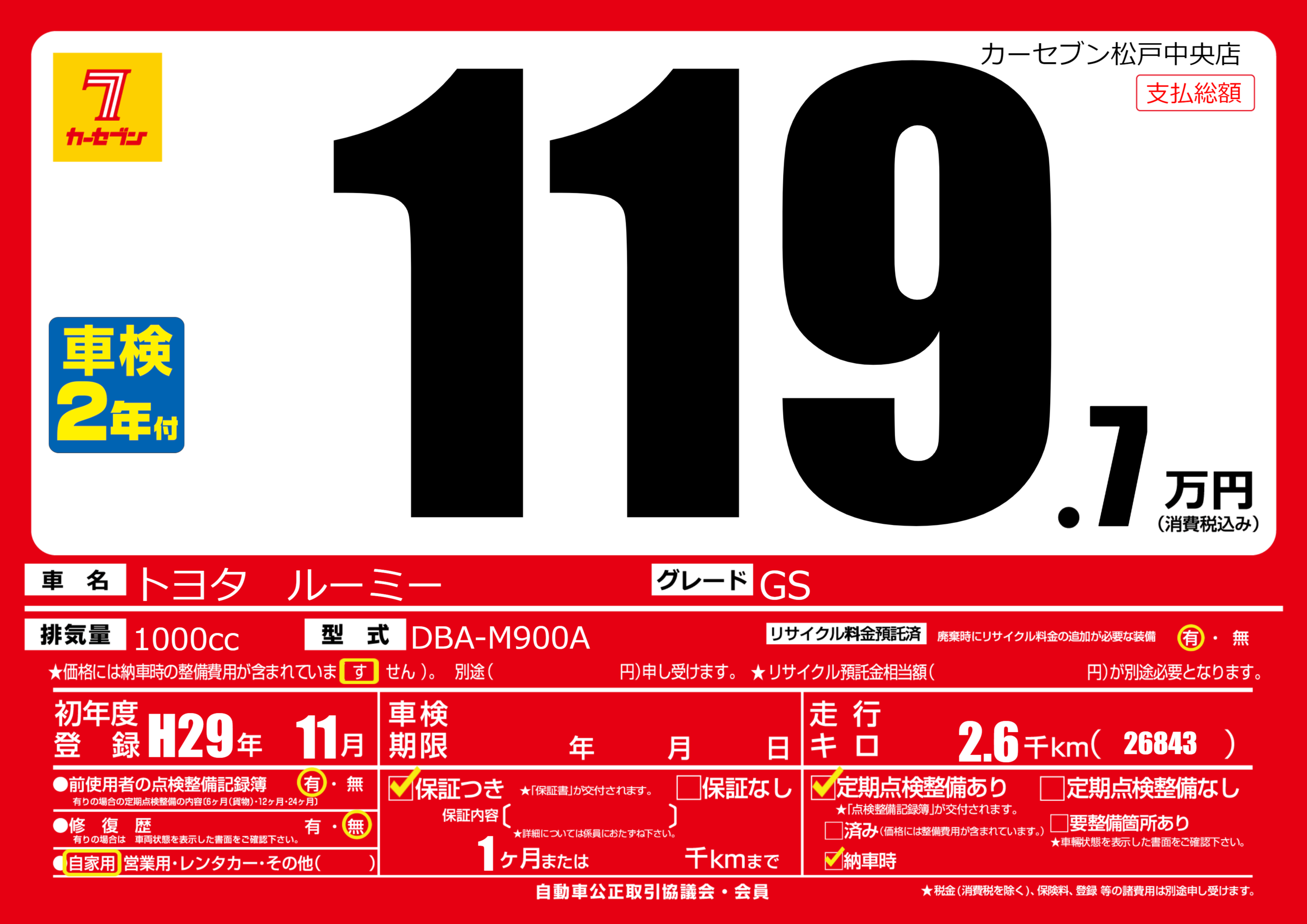 | 車名 | トヨタ ルーミー | グレード ミッション 排気量 |